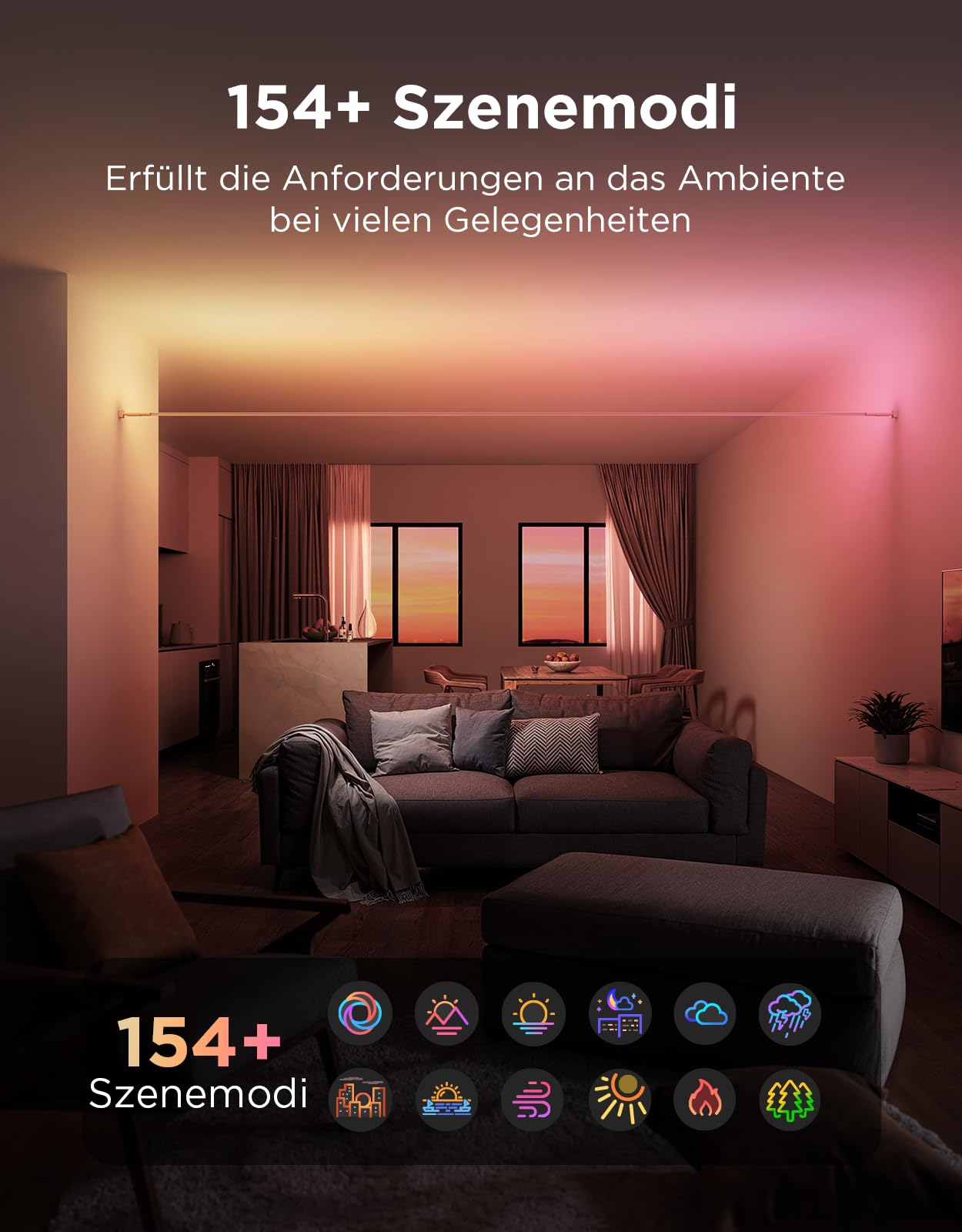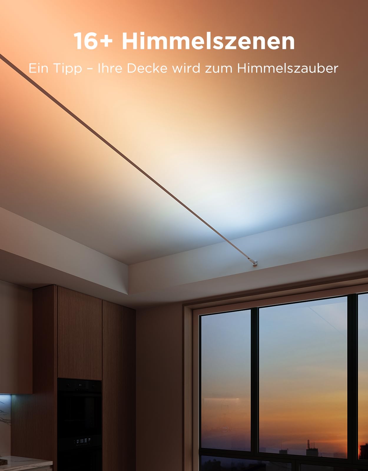 Das spezielle Skyline Kit erzeugt einen einzigartigen Wandflut-Effekt, der Ihren Räumen eine beeindruckende Tiefenwirkung und ein verträumtes Ambiente verleiht. Die indirekte Beleuchtung schafft eine gemütliche und gleichzeitig moderne Atmosphäre, ideal für Filmabende, Partys oder entspannte Stunden.