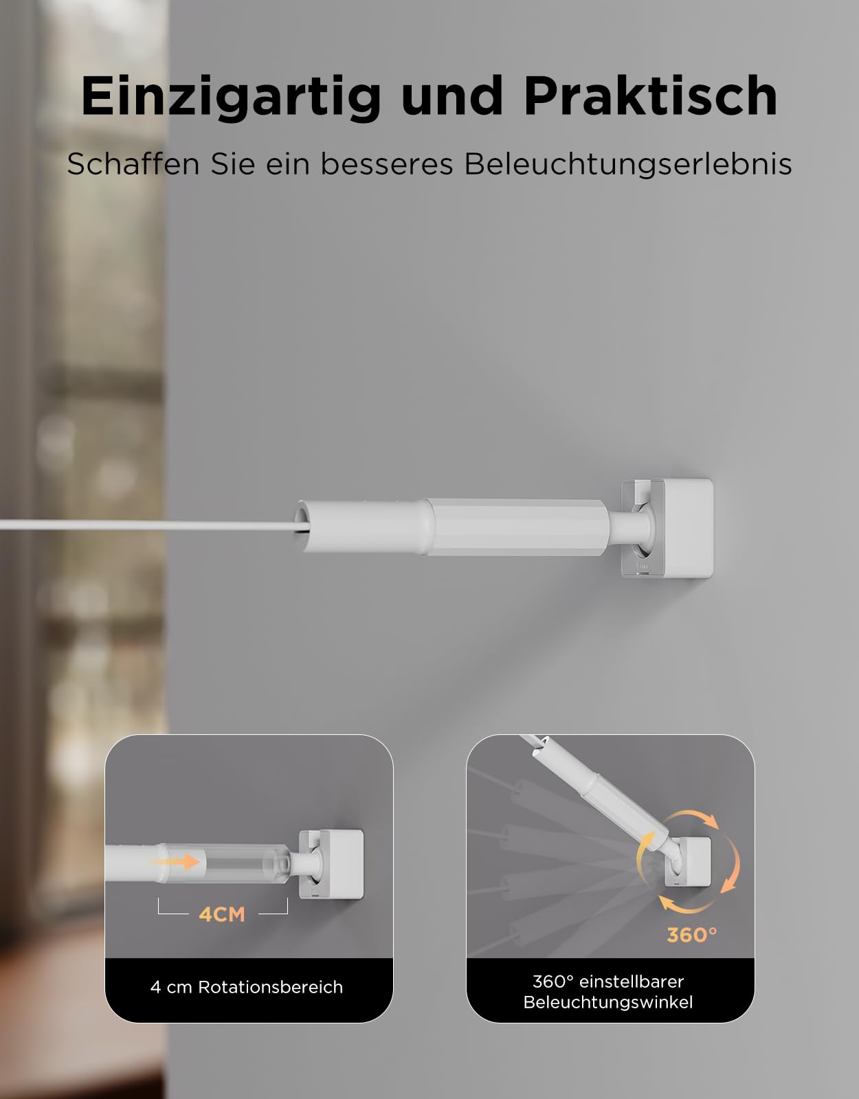 - Flexible Montage: Die 4 Meter langen Streifen werden stabil verschraubt und verfügen über 360° drehbare Schwenkarme, die sich auch an unebene Wände anpassen.