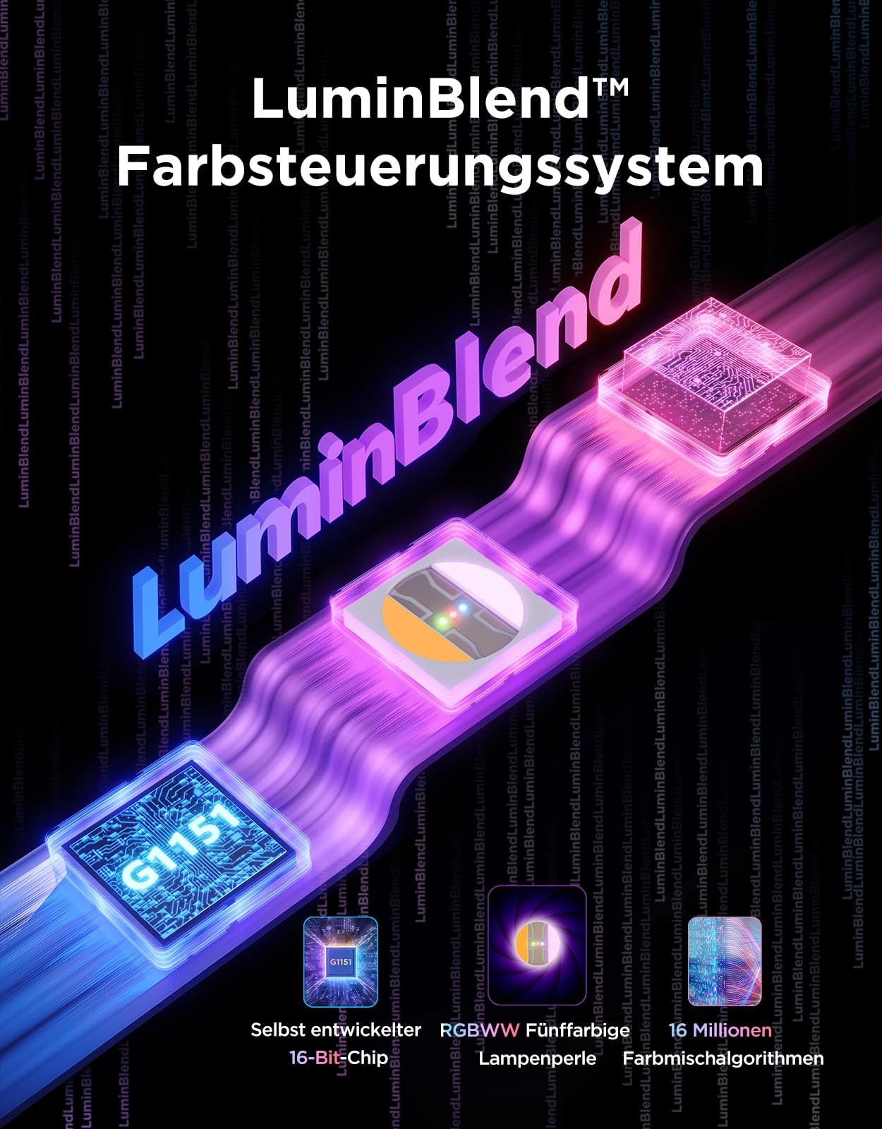 - LuminBlend-Technologie: Ein 16-Bit-Chip und die RGBWW-Mischtechnik stellen bis zu 281 Quintillionen Farben dar, mit optimierter Genauigkeit bei geringer Sättigung und besonders sanften Übergängen.