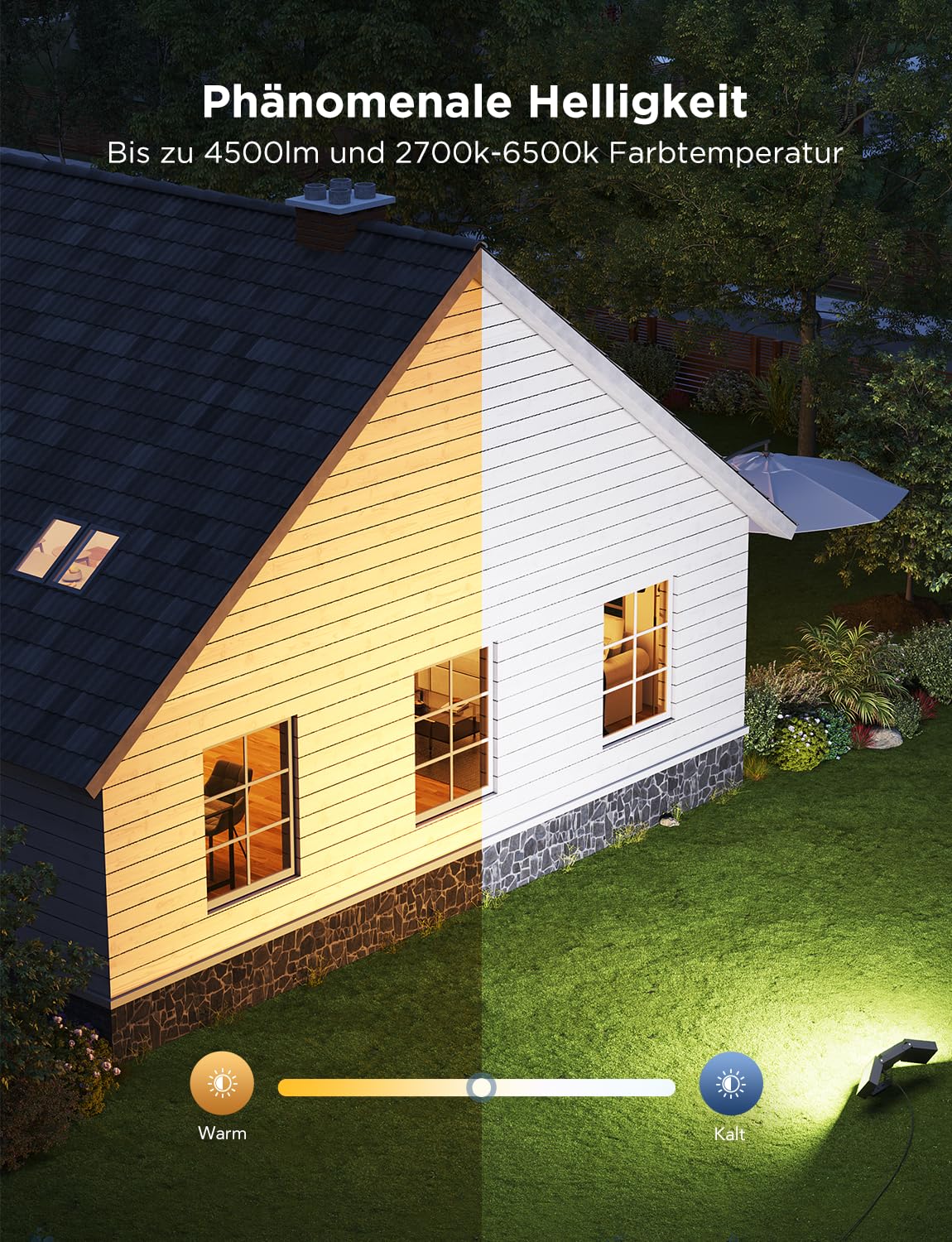 Dank der RGBICWW-Technologie bietet der Strahler ein Spektrum von 16 Millionen Farben sowie warm- und kaltweisse Töne. Mit einer aussergewöhnlichen Helligkeit von 4500 Lumen kann er Flächen von bis zu 40 m² mühelos und intensiv ausleuchten.