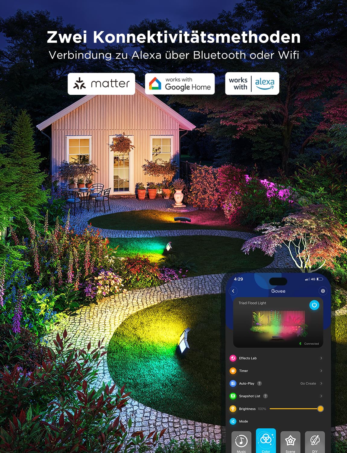 Sie können den Strahler flexibel über die Govee Home App (via Bluetooth & WLAN) oder per Sprachbefehl steuern. Er ist vollständig kompatibel mit Matter, Alexa und Google Assistant und lässt sich so nahtlos in Ihr bestehendes Smart-Home-System integrieren.