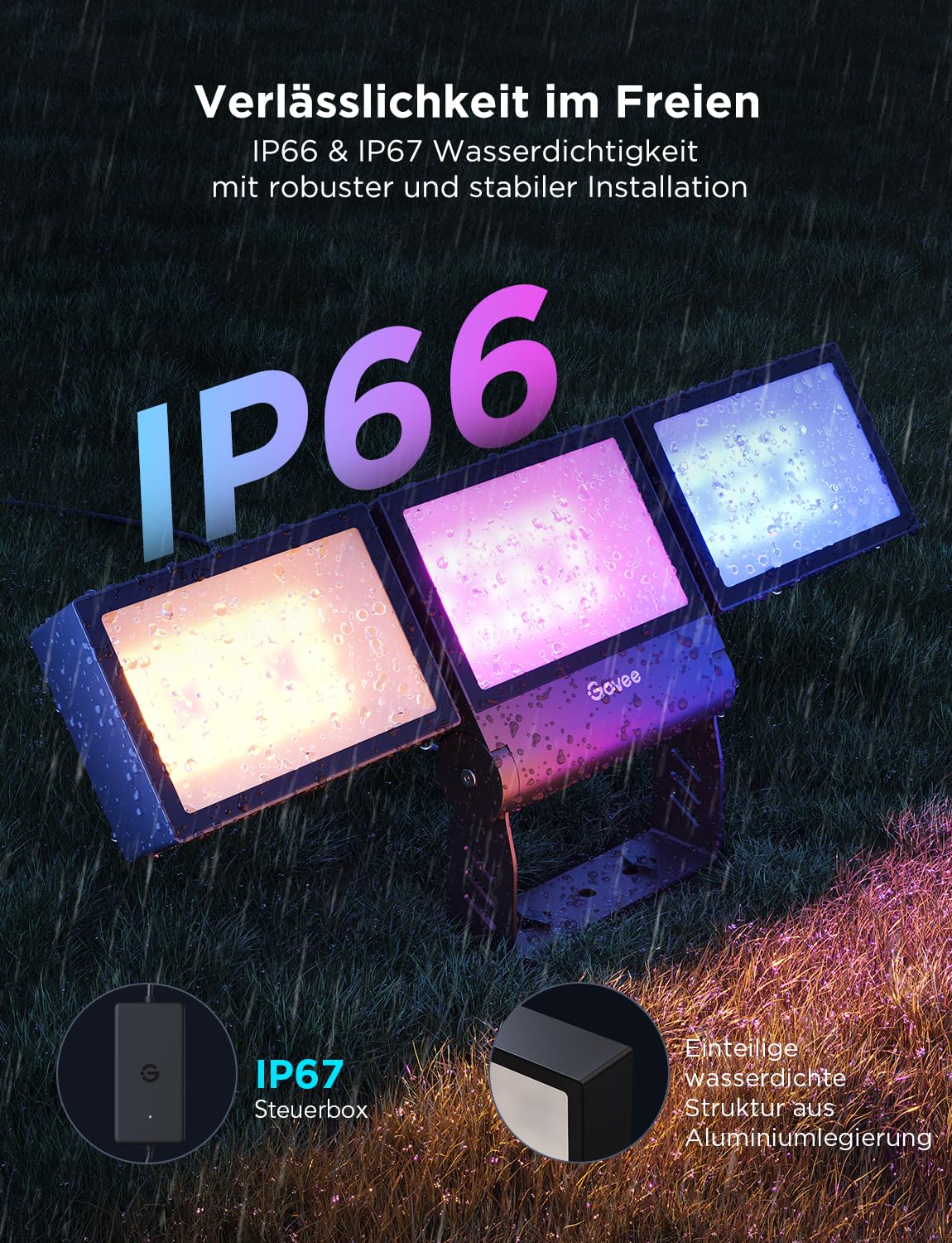 Dieser Strahler ist für den dauerhaften Einsatz im Freien konzipiert. Das Gehäuse aus einer robusten Aluminiumlegierung dient nicht nur der Langlebigkeit und Wärmeableitung, sondern hält auch externen Kräften stand. Mit Schutzklassen von IP66 für den Fluter, IP67 für die Steuerbox und IP44 für den Adapter ist ein zuverlässiger Betrieb bei jedem Wetter sichergestellt.