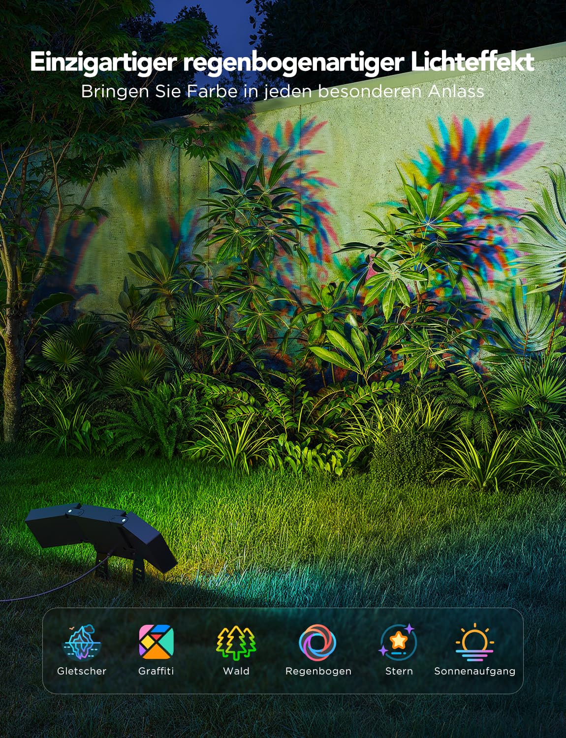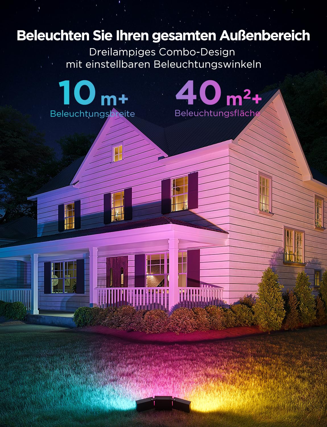 Schaffen Sie für jede Gelegenheit das passende Ambiente. Dank der enormen Helligkeit und dem breiten Farbspektrum können Sie Ihren Garten, Ihre Terrasse oder die Hausfassade nach Belieben gestalten – von einer dezenten, warmweissen Beleuchtung bis hin zu lebhaften, bunten Lichtszenarien für Feste und Veranstaltungen.