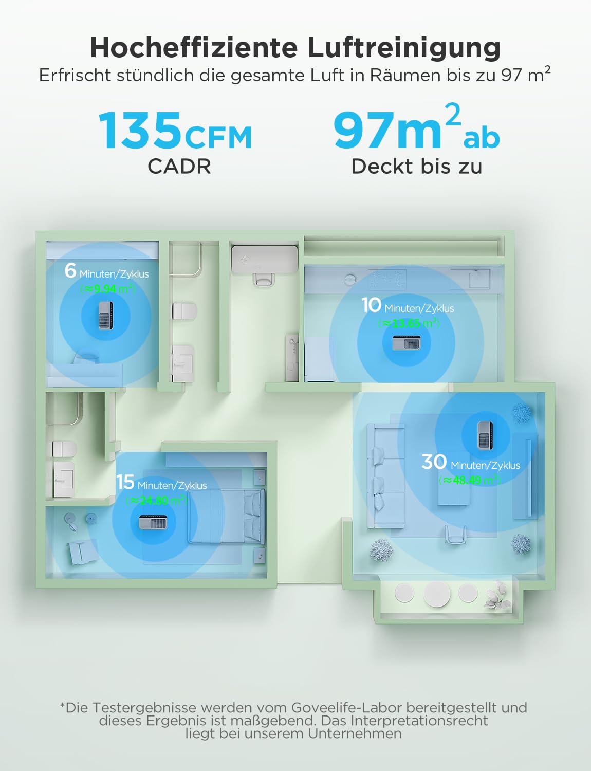 - Leistungsstarke Luftreinigung: Mit einem beeindruckenden Luftdurchsatz (CADR) von 135 CFM reinigt dieses Gerät die Luft in Räumen bis zu 97 m² einmal pro Stunde und gewährleistet so konstant saubere Luft.