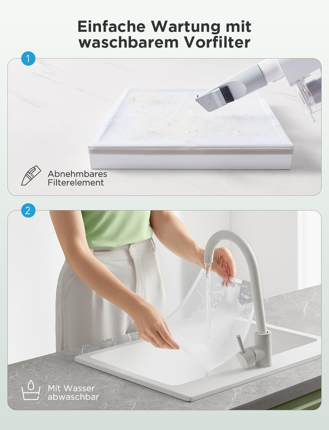- Nachhaltige Filterung: Der Vorfilter ist waschbar, was die Lebensdauer des gesamten Filtersystems verlängert. Ein zusätzlicher Aktivkohlefilter neutralisiert zudem effektiv Tier- und andere unangenehme Gerüche.