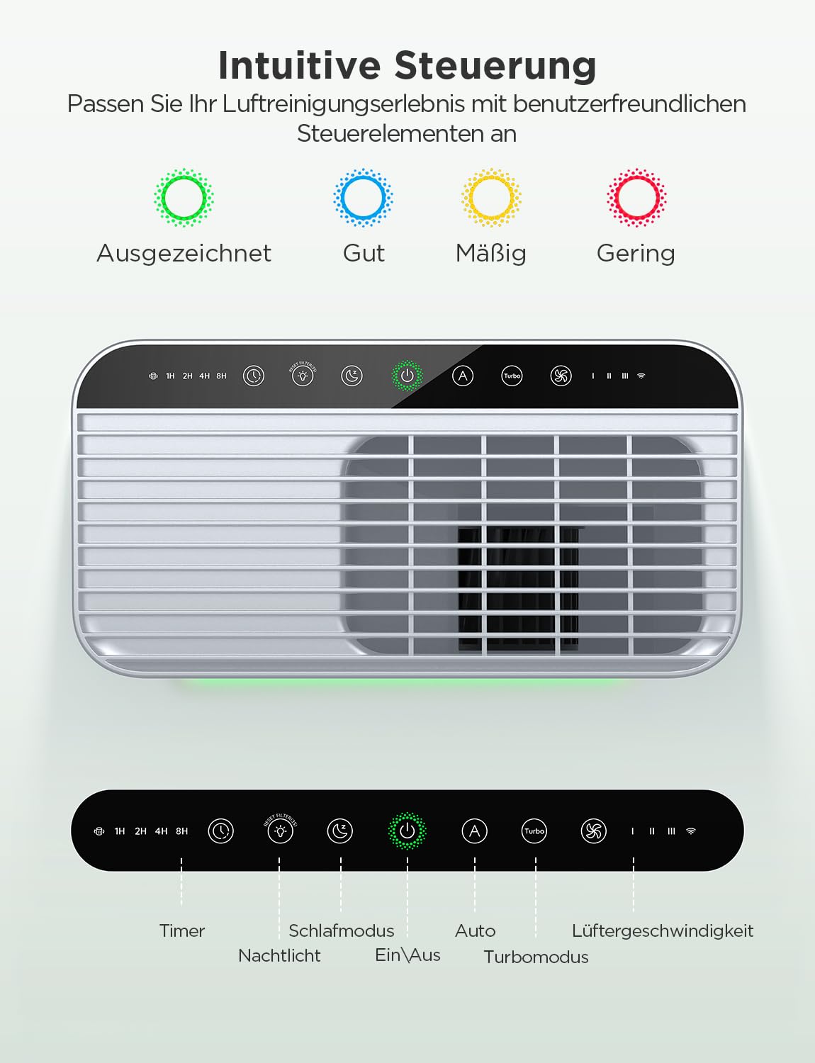 - Smarte Steuerung: Verbinden Sie den Luftreiniger einfach mit der App, Alexa oder IFTTT. So können Sie ihn bequem fernsteuern und die Entwicklung der Luftqualität in Echtzeit mitverfolgen (unterstützt nur 2.4-GHz-WLAN).