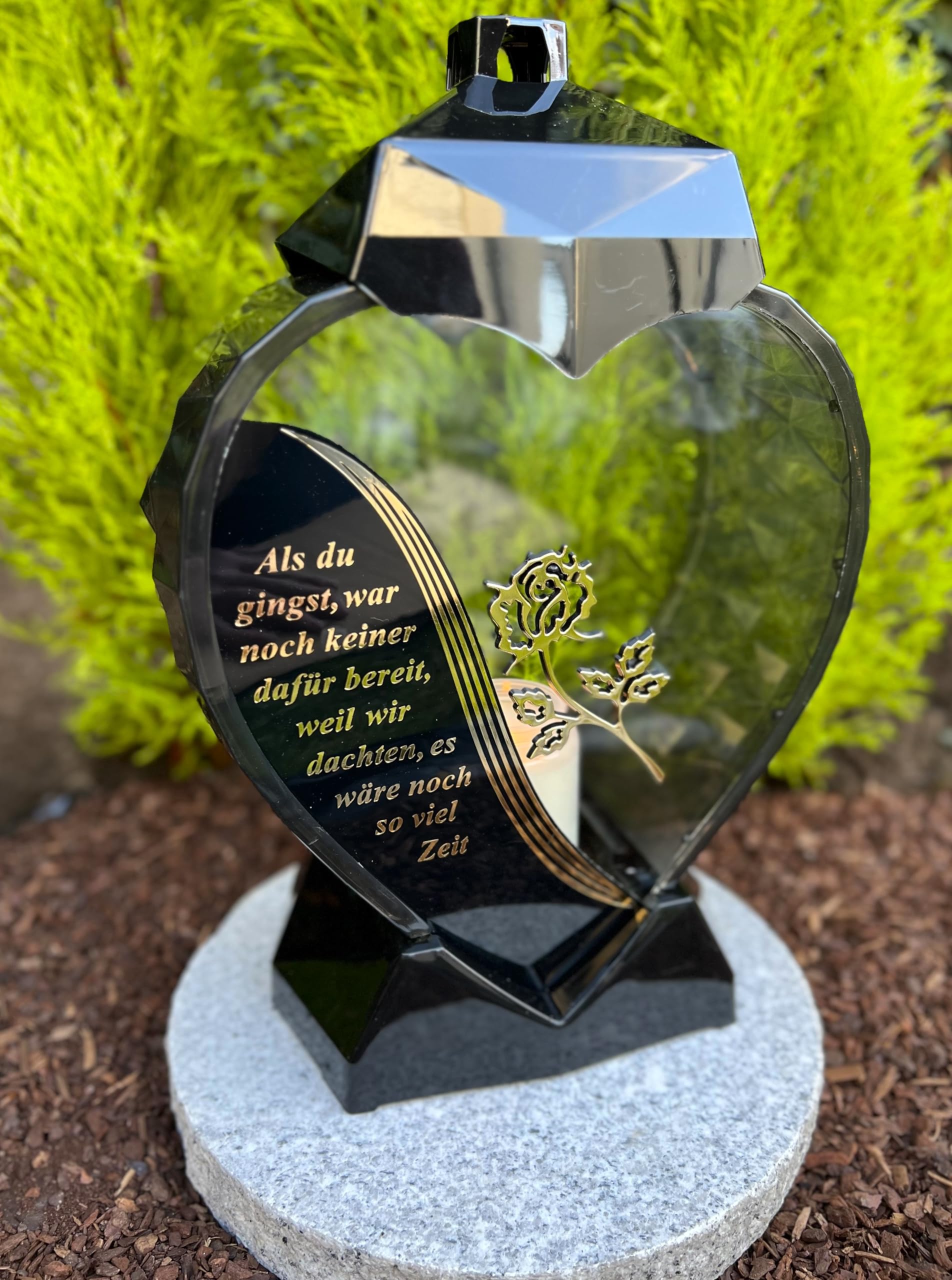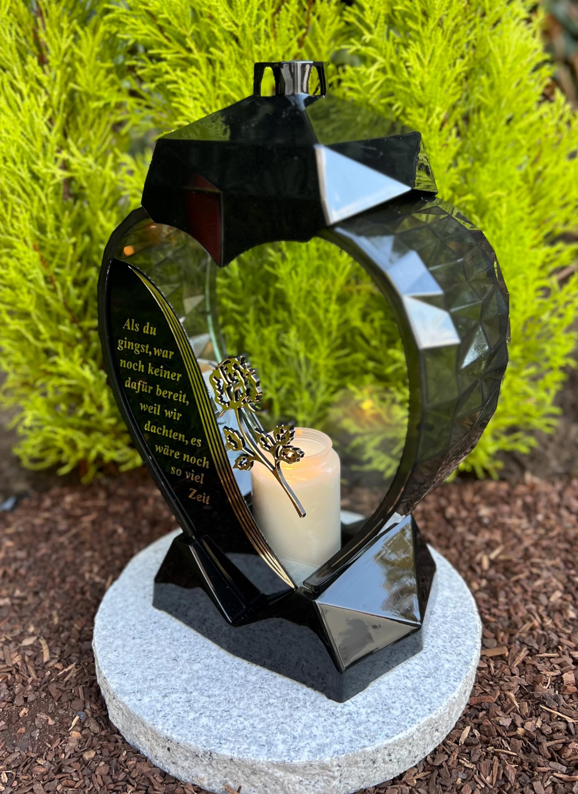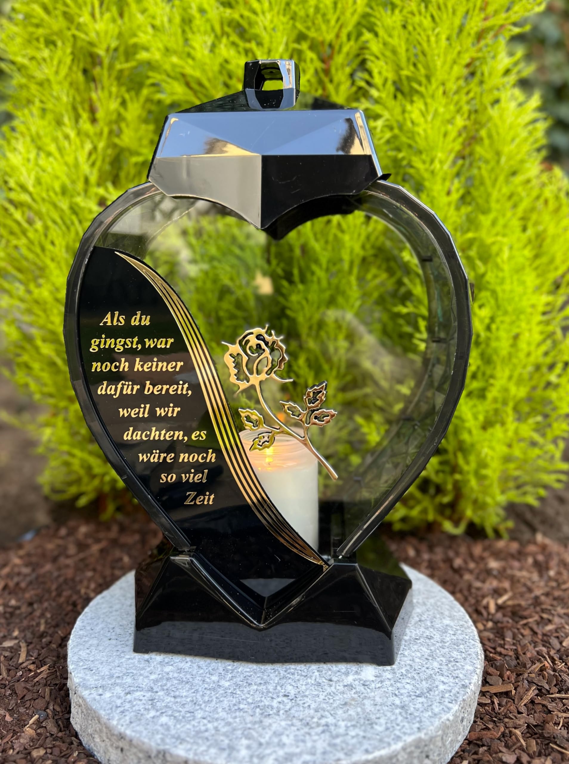 Diese liebevoll gestaltete Grablaterne in Herzform ist ein würdevolles Zeichen der Erinnerung und Zuneigung für einen besonderen Menschen.