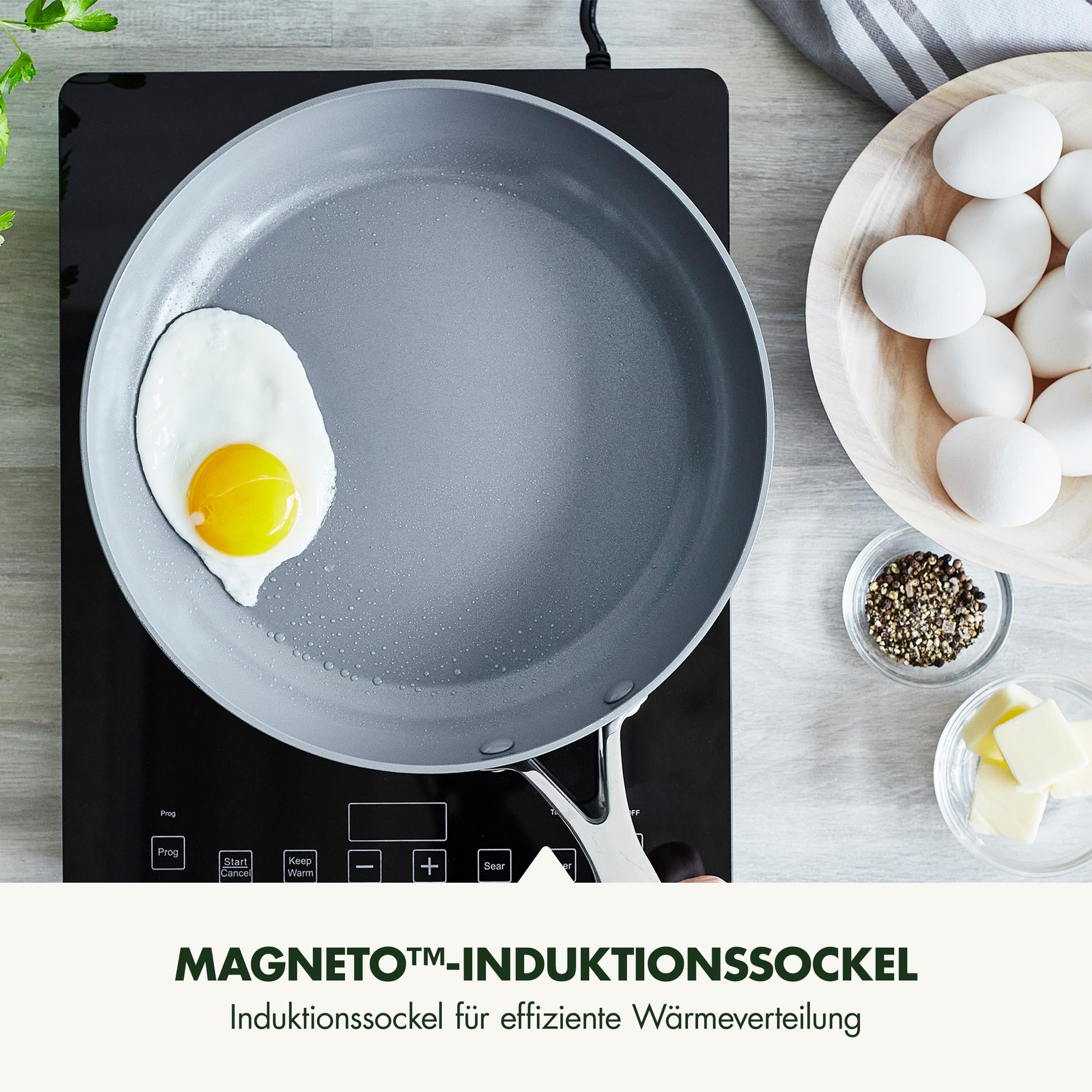 - Effizienter Magneto™ Induktionsboden: Sorgt für eine schnelle, gleichmässige Wärmeverteilung auf allen Herdarten, inklusive Induktion, für perfekte Bratergebnisse.