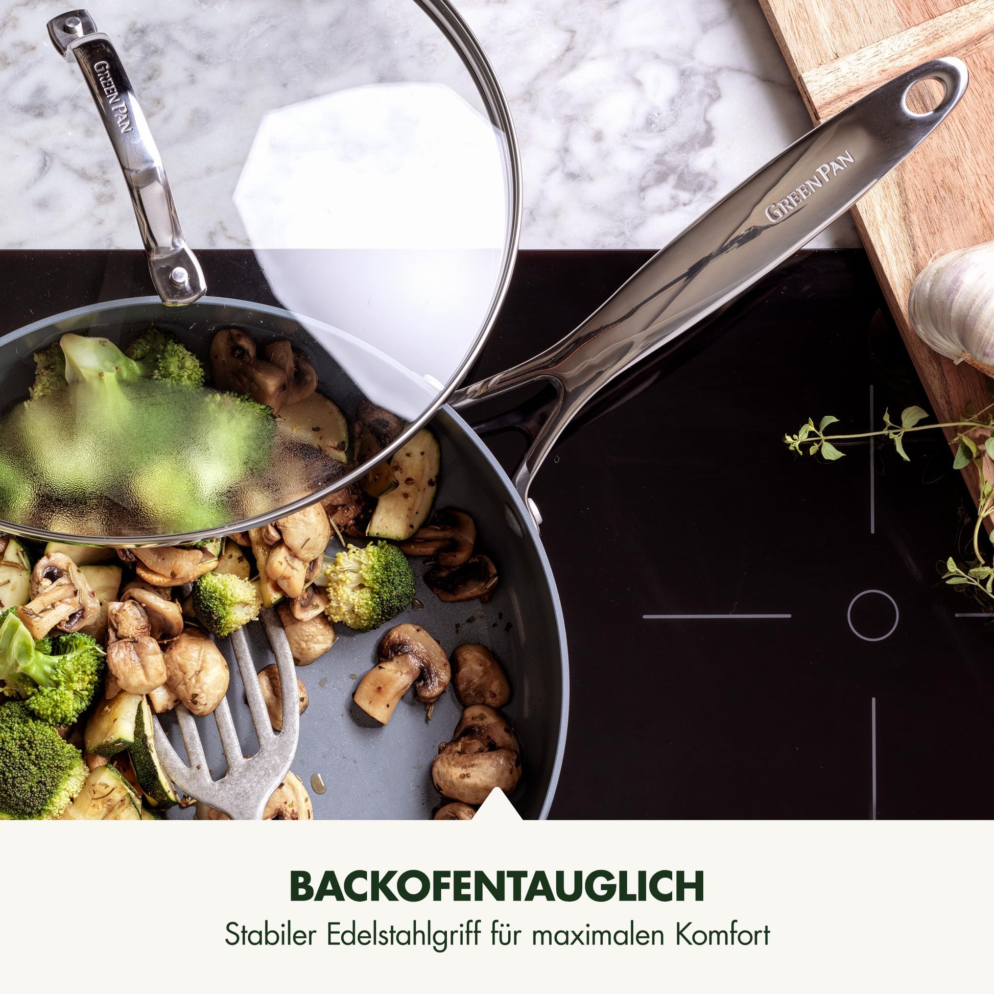 GreenPan hat sich der Mission verschrieben, Küchen weltweit PFAS-frei zu machen. Mit der Entscheidung für dieses Produkt wählen Sie bewusst ein sorgenfreies Kocherlebnis ohne bedenkliche Chemikalien und unterstützen eine nachhaltige Kochkultur.