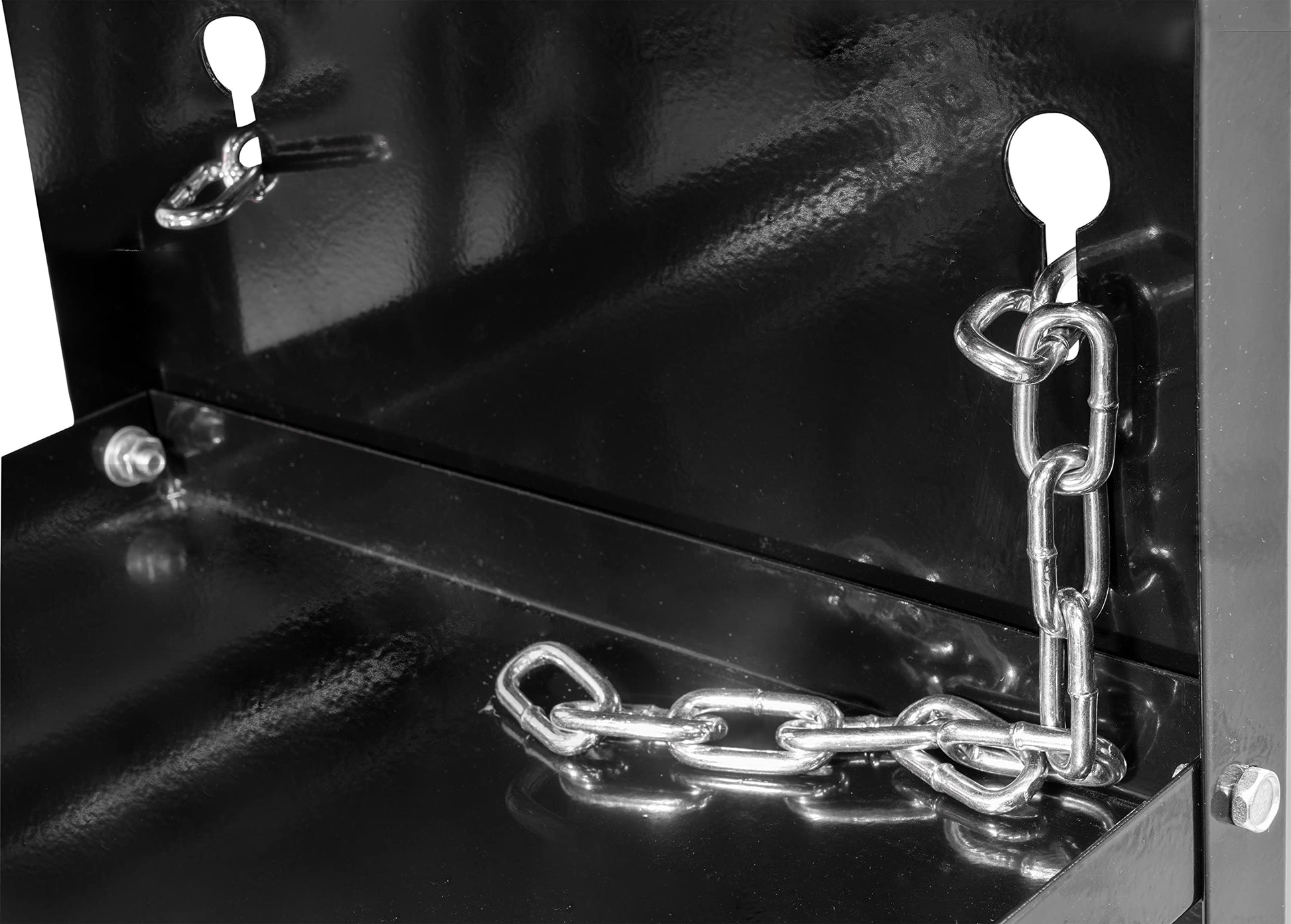 - Sichere Gasflaschenhalterung: Ein fester Platz für die Gasflasche, gesichert mit zwei verstellbaren Sicherheitsketten.