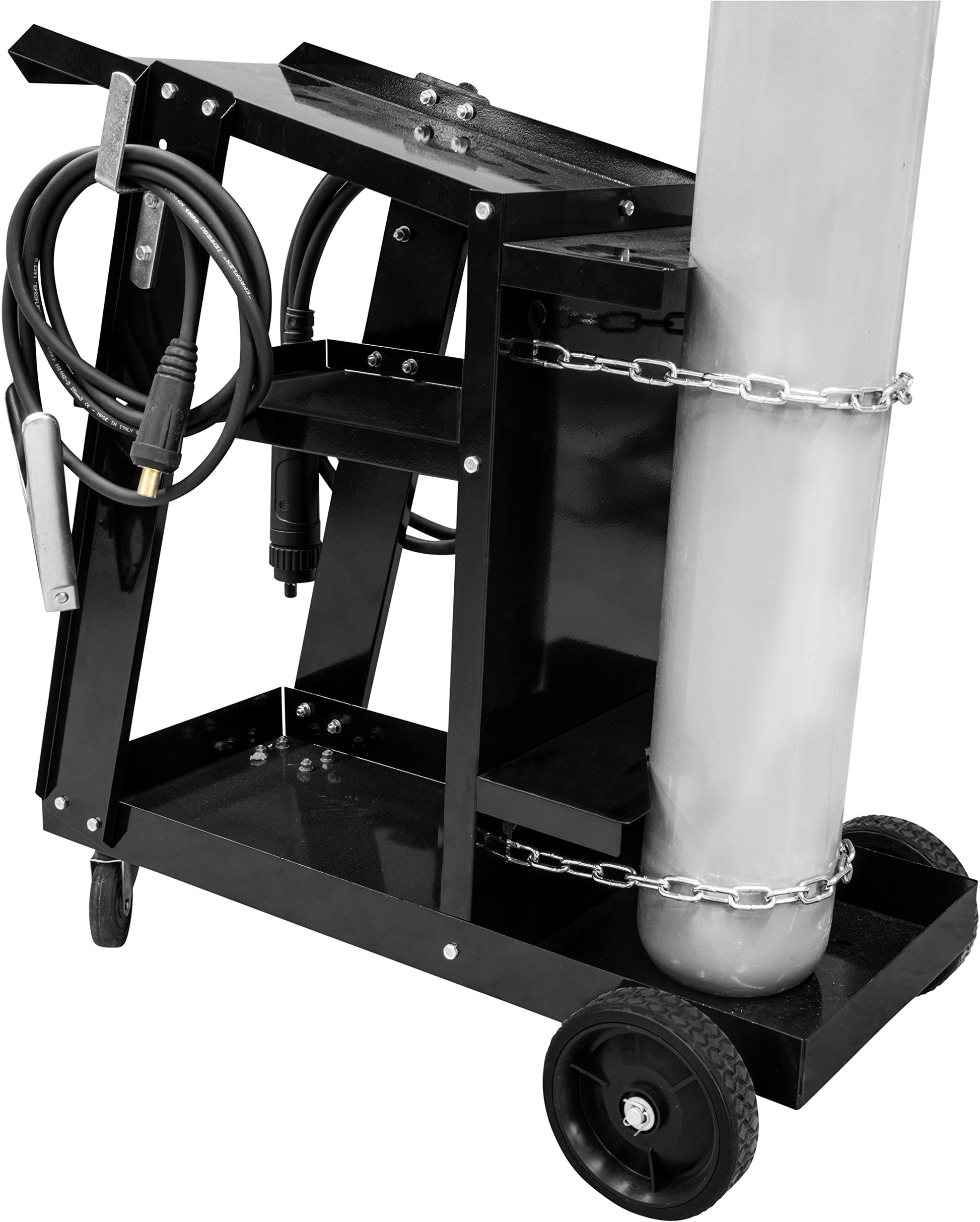 Ja, der Wagen ist auf maximale Ordnung ausgelegt. Er verfügt über drei grosszügige Ebenen für Gerät und Zubehör sowie praktische, beidseitige Halterungen zum ordentlichen Aufhängen von Brenner-, Elektroden- und Massekabeln.