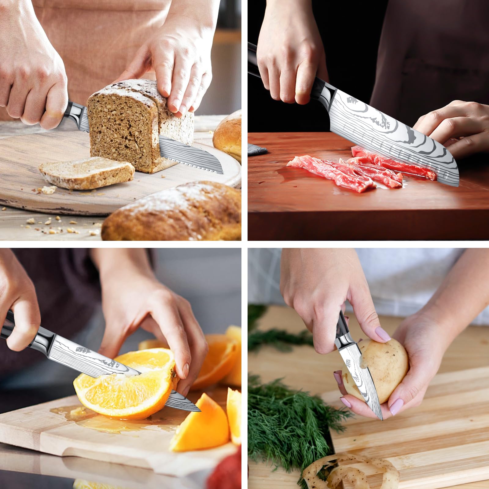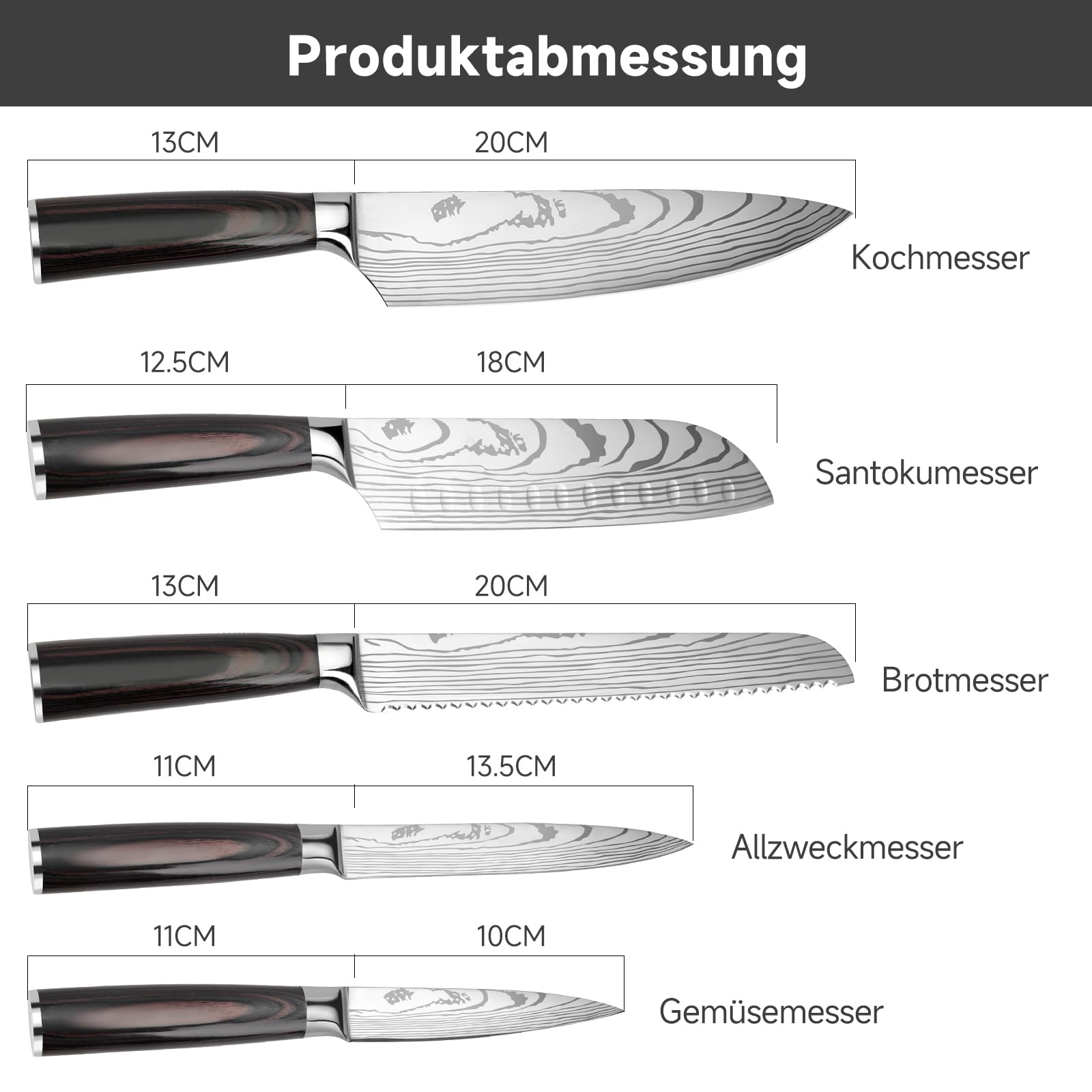 - Komplettes 5-teiliges Set: Beinhaltet ein Kochmesser, Brotmesser, Santokumesser, Allzweckmesser und Gemüsemesser, um allen Schneidaufgaben gerecht zu werden.