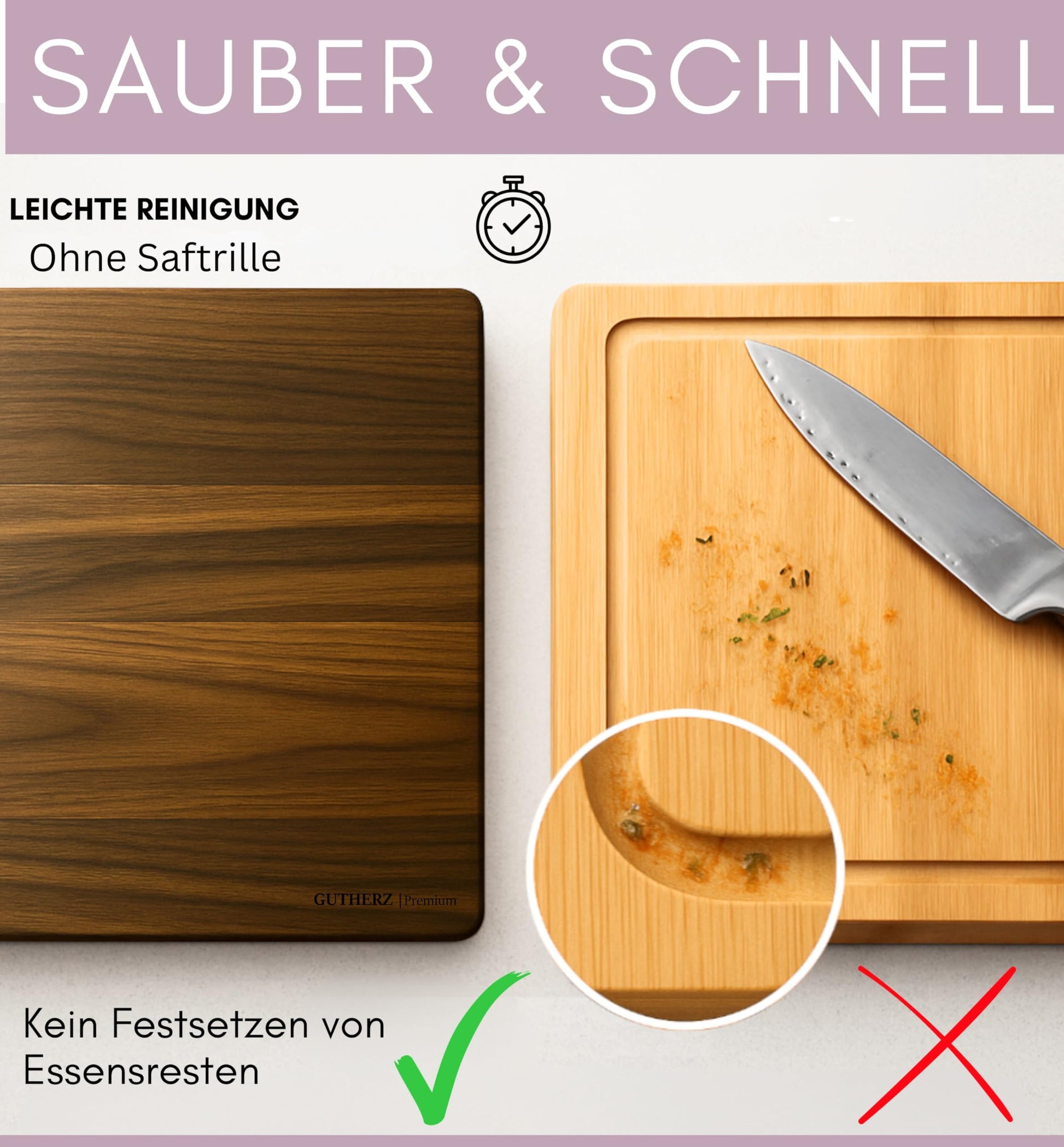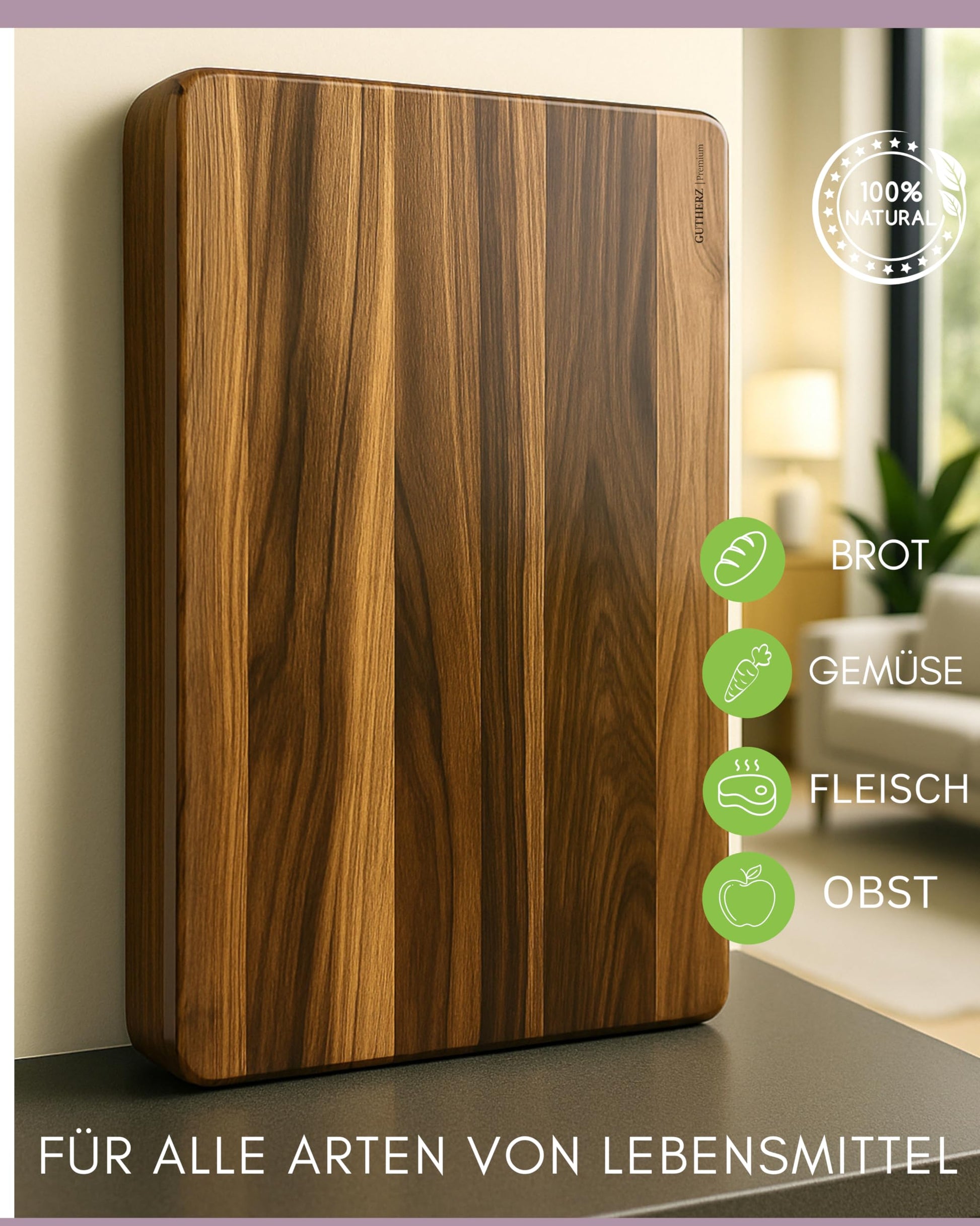 Entdecken Sie dieses grosszügige Schneidebrett von Gutherz, gefertigt aus massivem Walnussholz. Es vereint erstklassige Funktionalität mit der natürlichen Eleganz von edlem Holz und wird so zum Herzstück Ihrer Küche.