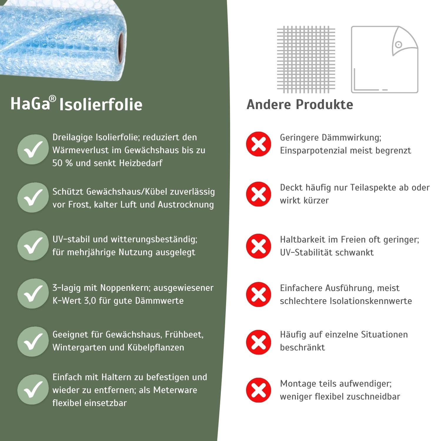 Die von der Marke HaGa hergestellte Luftpolsterfolie besteht aus problemstofffreiem Polyethylen und ist somit vollständig pflanzenverträglich. Sie können sicher sein, dass Ihre Pflanzen ohne schädliche Einflüsse geschützt werden.