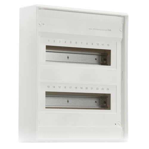 Der Hager VA 24 CN Kleinverteiler verfügt über 2 Reihen für Einbaugeräte. Jede Reihe bietet Platz für 12 Teilungseinheiten (TE), was eine Gesamtkapazität von 24 TE für Sicherungsautomaten und andere Reiheneinbaugeräte ergibt.
