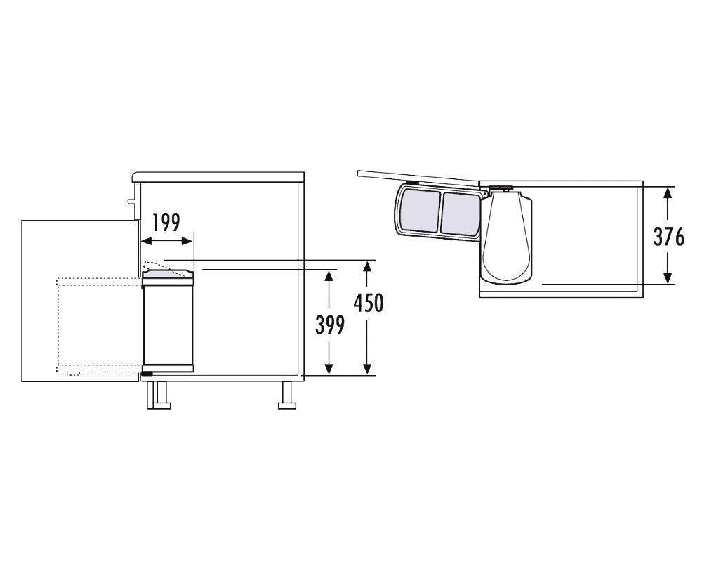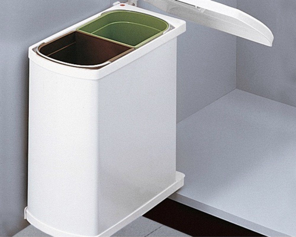 Dieses Abfalltrennsystem ist speziell für den Einbau in Küchen-Unterschränke mit einer Mindestbreite von 45 cm konzipiert, die eine klassische Drehtür haben. Die Montage erfolgt am Schrankboden und der Schwenkmechanismus sorgt dafür, dass der Mülleimer beim Öffnen der Tür automatisch herausfährt.