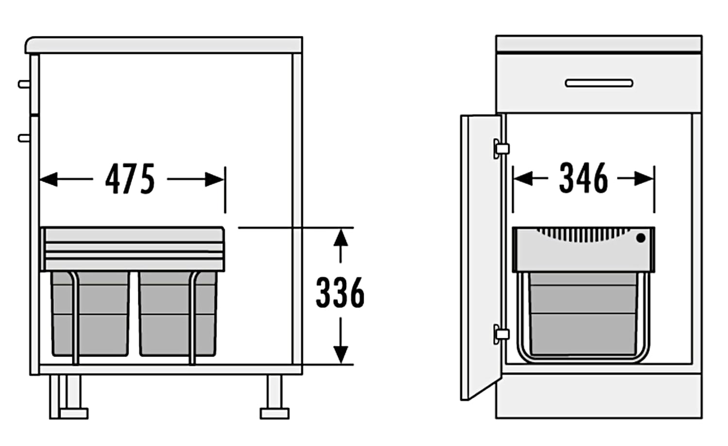 Dieses System ist für Unterschränke ab 40 cm Breite mit einer Drehtür (links oder rechts angeschlagen) konzipiert. Messen Sie vor dem Kauf bitte die lichten Innenmasse Ihres Schranks: Sie benötigen mindestens 346 mm in der Breite, 475 mm in der Tiefe und 336 mm in der Höhe. Die Montage erfolgt direkt auf dem Schrankboden.
