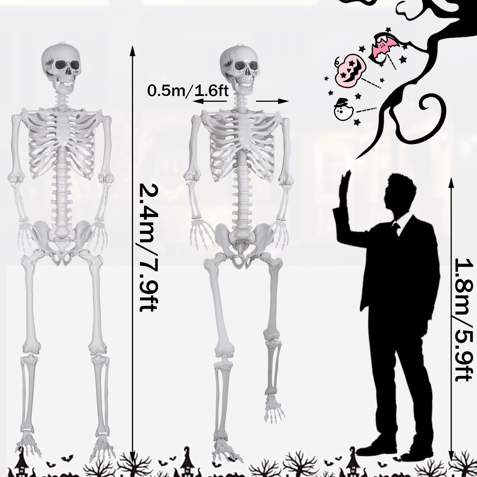 - Voll beweglich: Dank flexibler Gelenke können Sie das Skelett in unzähligen schaurigen Posen arrangieren – sitzend, stehend oder kriechend.