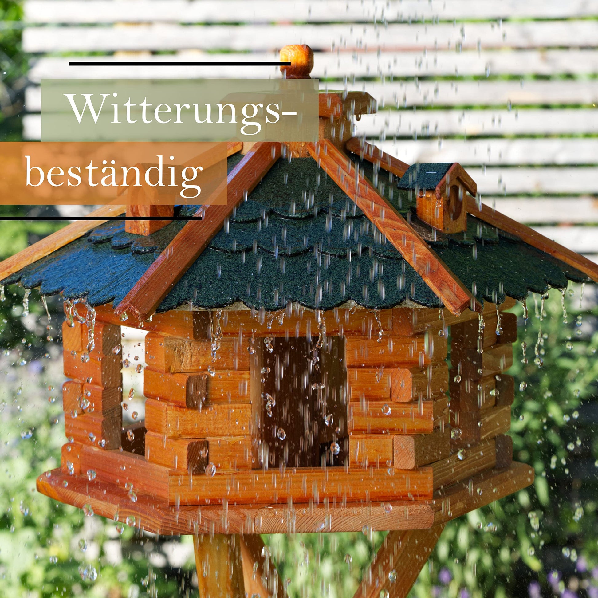Ja, das Vogelhaus ist für eine hohe Langlebigkeit konzipiert. Es ist mit einem Holzschutzmittel vorbehandelt und verfügt über ein Dach aus wasserundurchlässigem, wetterfestem Bitumen, das optimalen Schutz bei jeder Witterung bietet.