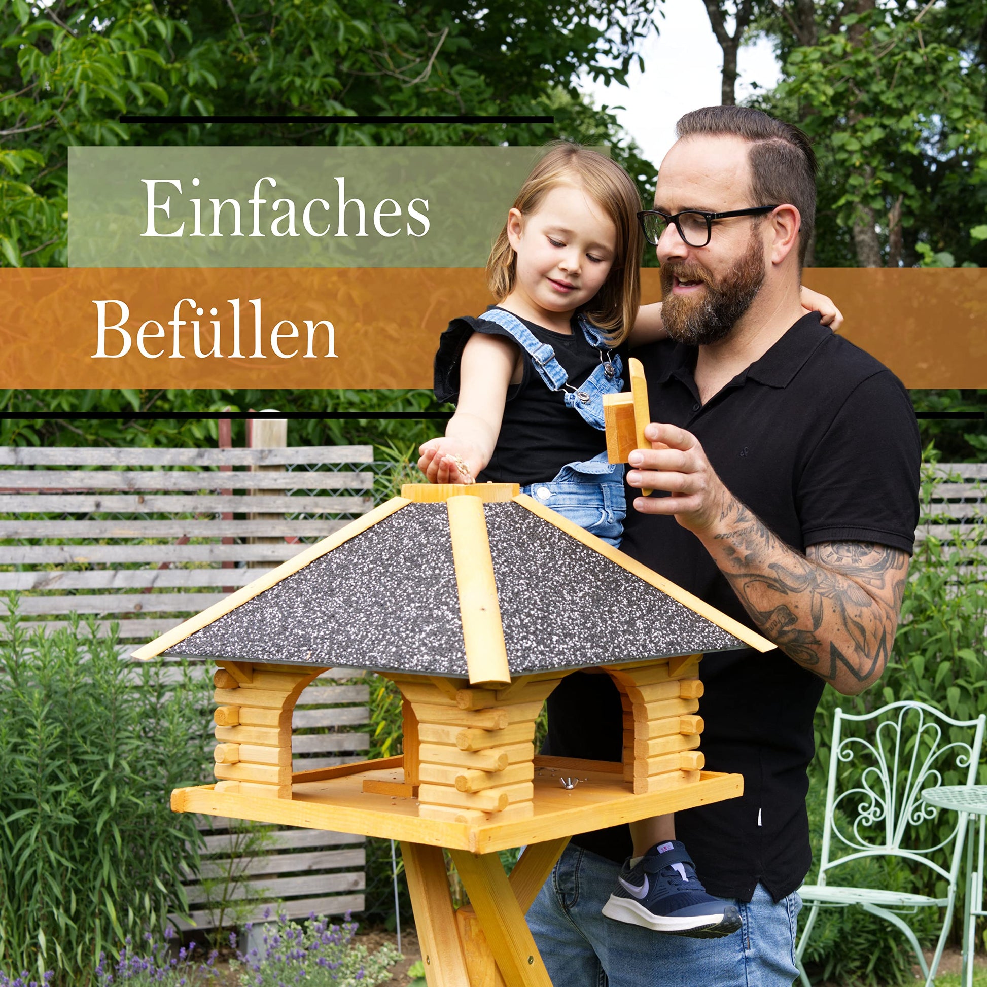 Dank des durchdachten Designs mit dem wetterfesten Dach bleibt das Vogelfutter stets vor Regen, Schnee und Verunreinigungen geschützt. Dies sorgt dafür, dass Ihre gefiederten Freunde immer frisches und trockenes Futter vorfinden.