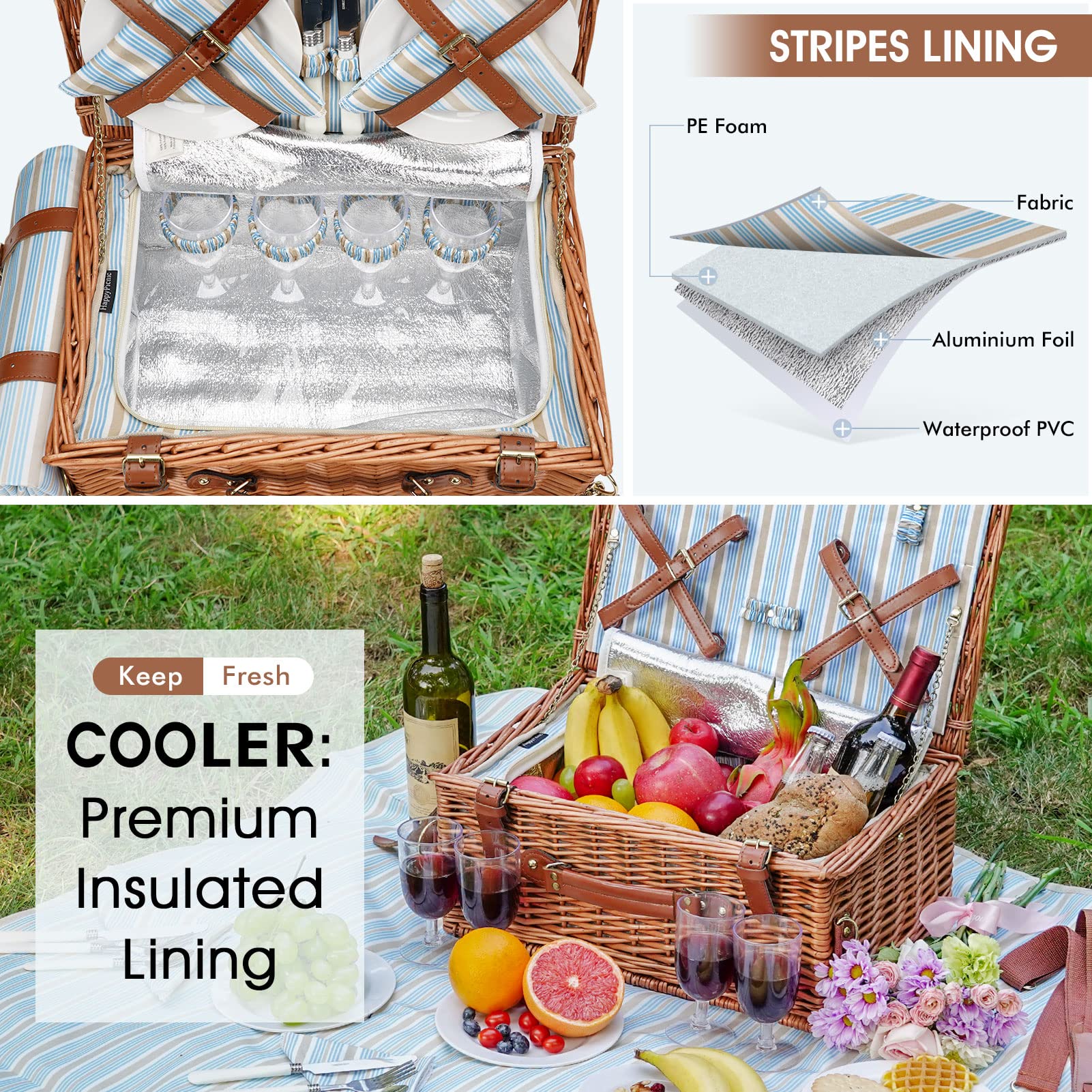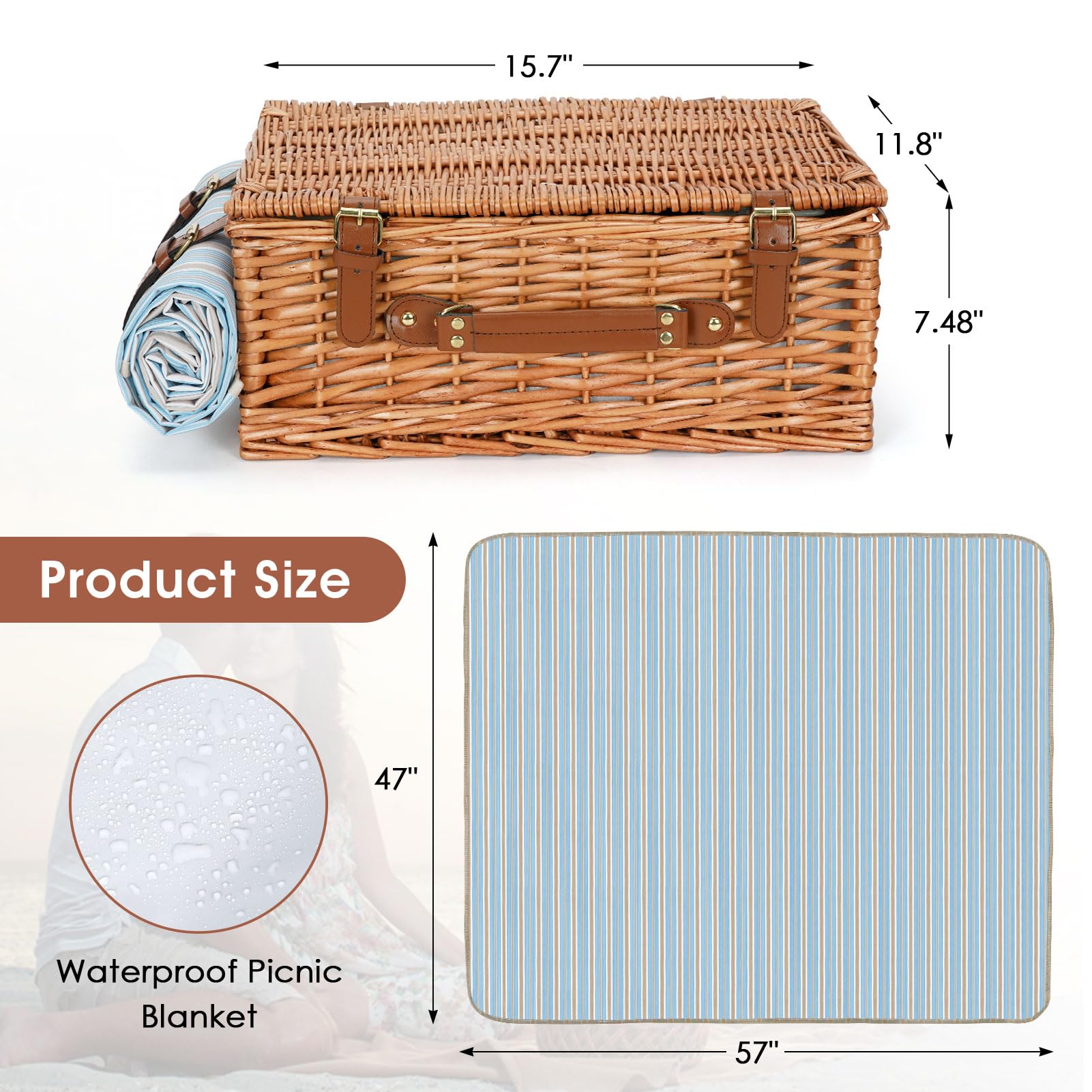 - Inklusive Picknickdecke: Eine wasserabweisende Decke (ca. 145 x 120 cm) ist mit praktischen, verstellbaren Riemen an der Aussenseite des Korbes befestigt.