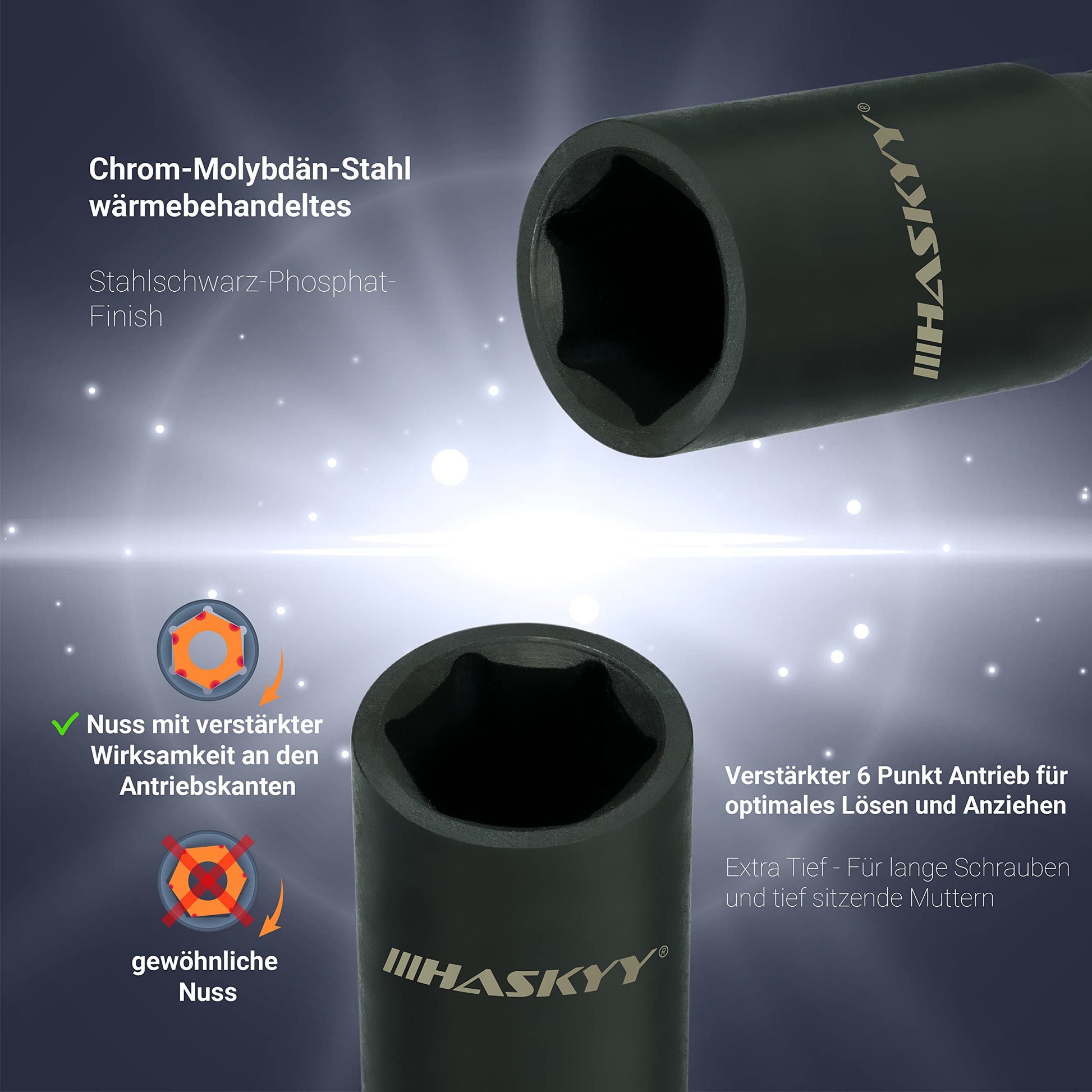 Die Nüsse sind aus einer hochfesten Legierung aus Chrom-Molybdän- und Chrom-Vanadium-Stahl gefertigt, was sie ideal für die hohen Belastungen durch Schlagschrauber macht. Eine spezielle Phosphat-Beschichtung mit "Black Polish"-Finish schützt die Werkzeuge zudem zuverlässig und langanhaltend vor Korrosion.