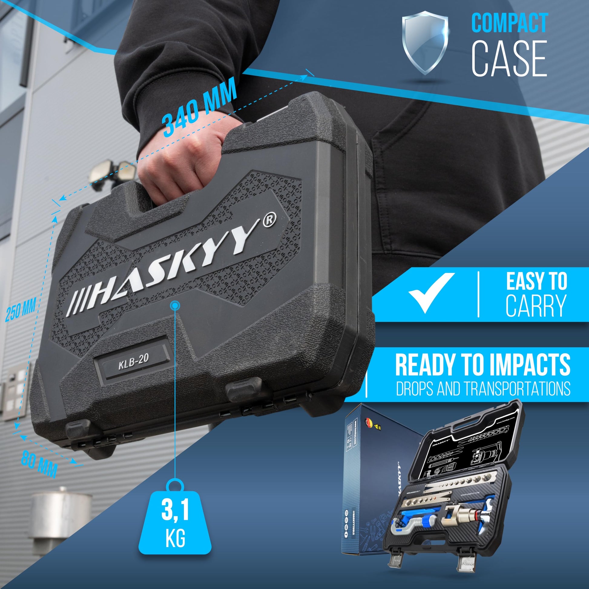 Dieses umfassende Bördelwerkzeug-Set von HASKYY ist die professionelle Lösung für das präzise Bearbeiten von Rohrleitungen und eignet sich ideal für den Einsatz in der Kälte- und Fahrzeugtechnik.