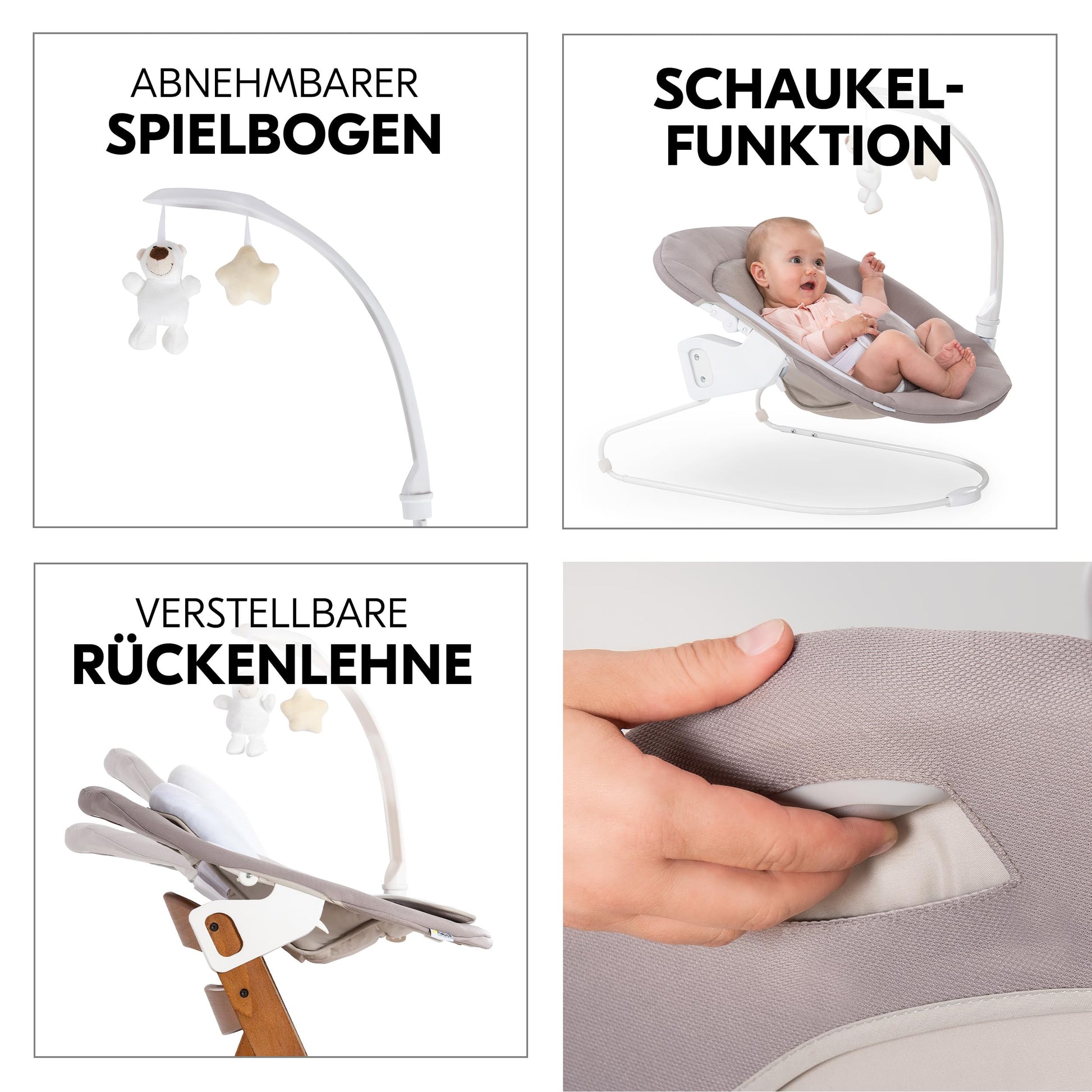 - Umfassendes 4-in-1-Set: Beinhaltet den Alpha Plus Holzhochstuhl, den multifunktionalen Alpha Bouncer 2in1 Deluxe Neugeborenenaufsatz (nutzbar als Babyliege und Wippe) sowie ein komfortables, zweiteiliges Sitzpolster.