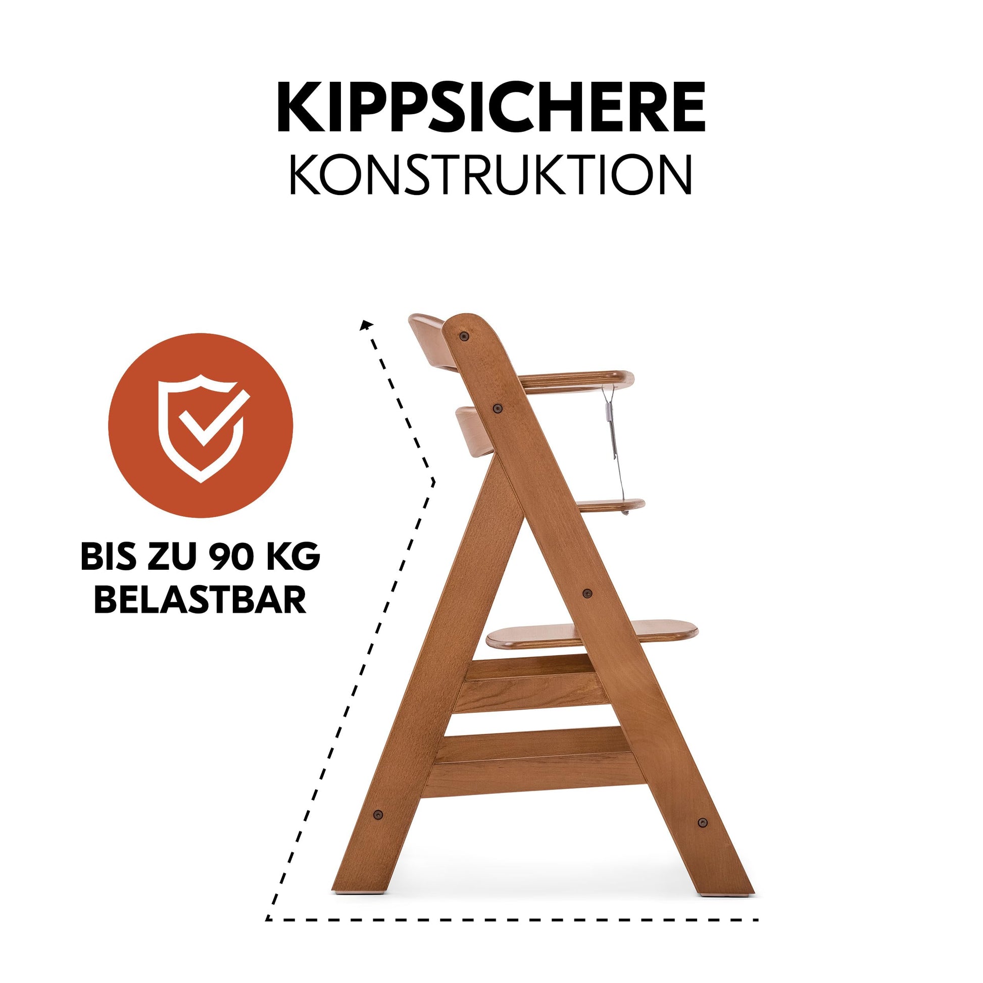 Der Alpha+ ist aus massivem, FSC-zertifiziertem Buchenholz gefertigt und durch seine spezielle Konstruktion besonders kippsicher. Für die Nutzung als Kinderhochstuhl sind ein Sicherheitsbügel, ein Schrittgurt sowie ein 5-Punkt-Gurtsystem im Lieferumfang des Basisstuhls enthalten, die Ihr Kind zuverlässig sichern.