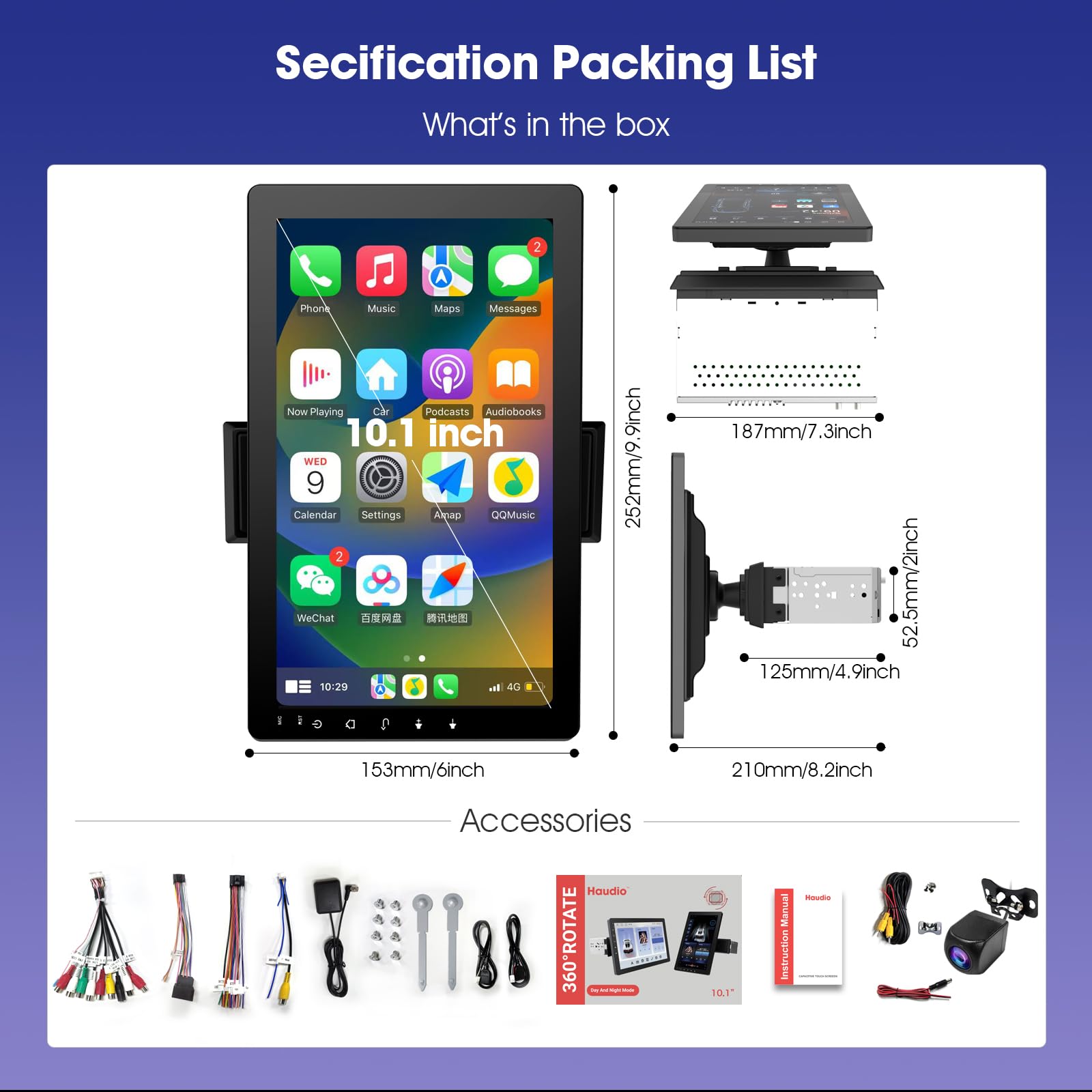 Haudio 1DIN Autoradio 10.1 Zoll drehbar - Wireless CarPlay/AA