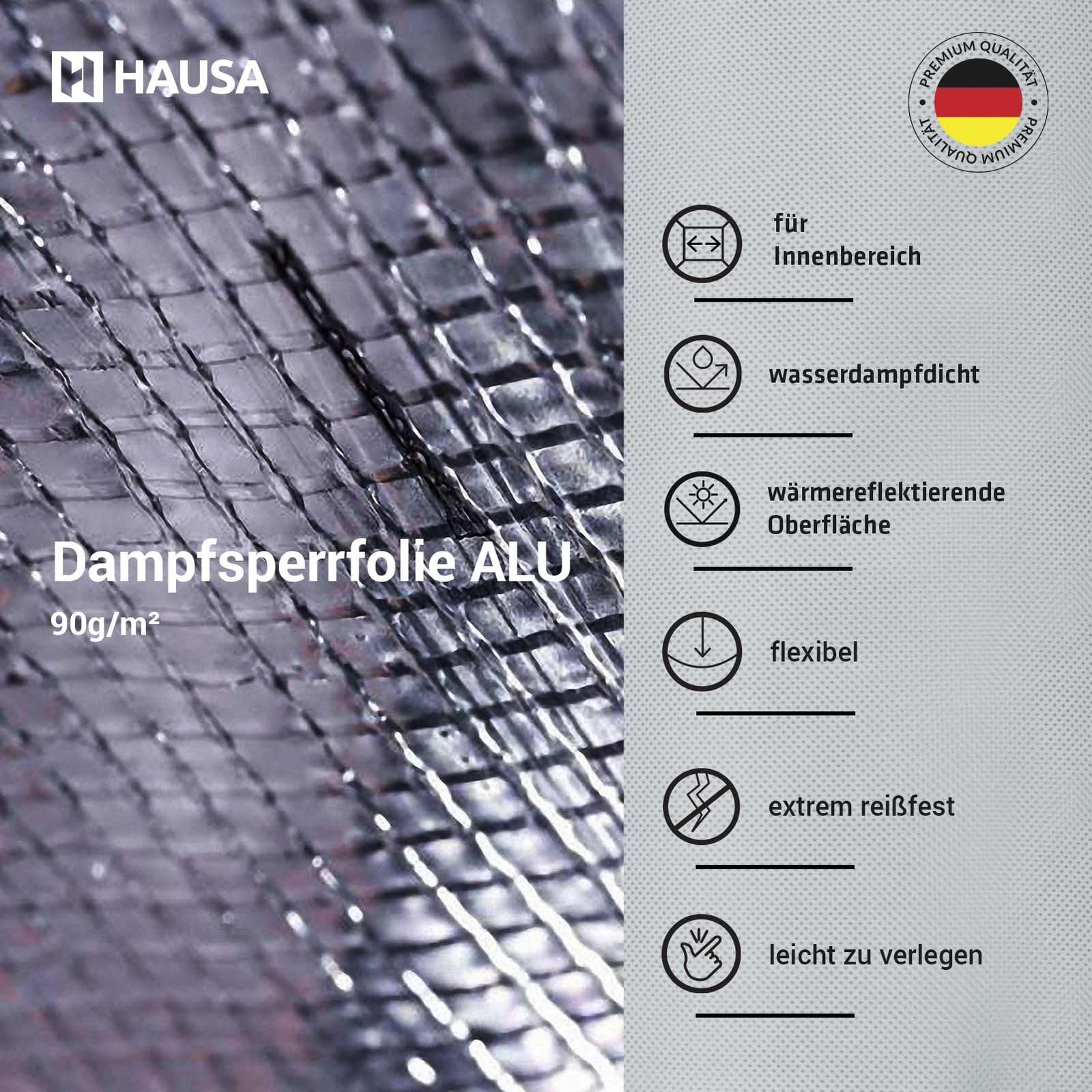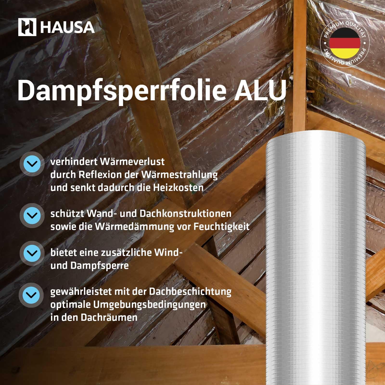 Schützen Sie Ihre Bausubstanz nachhaltig mit der HAUSA Dampfsperrfolie ALU, einer robusten und multifunktionalen Dampfsperrbahn für den professionellen Innenausbau und die Dachisolierung von innen.