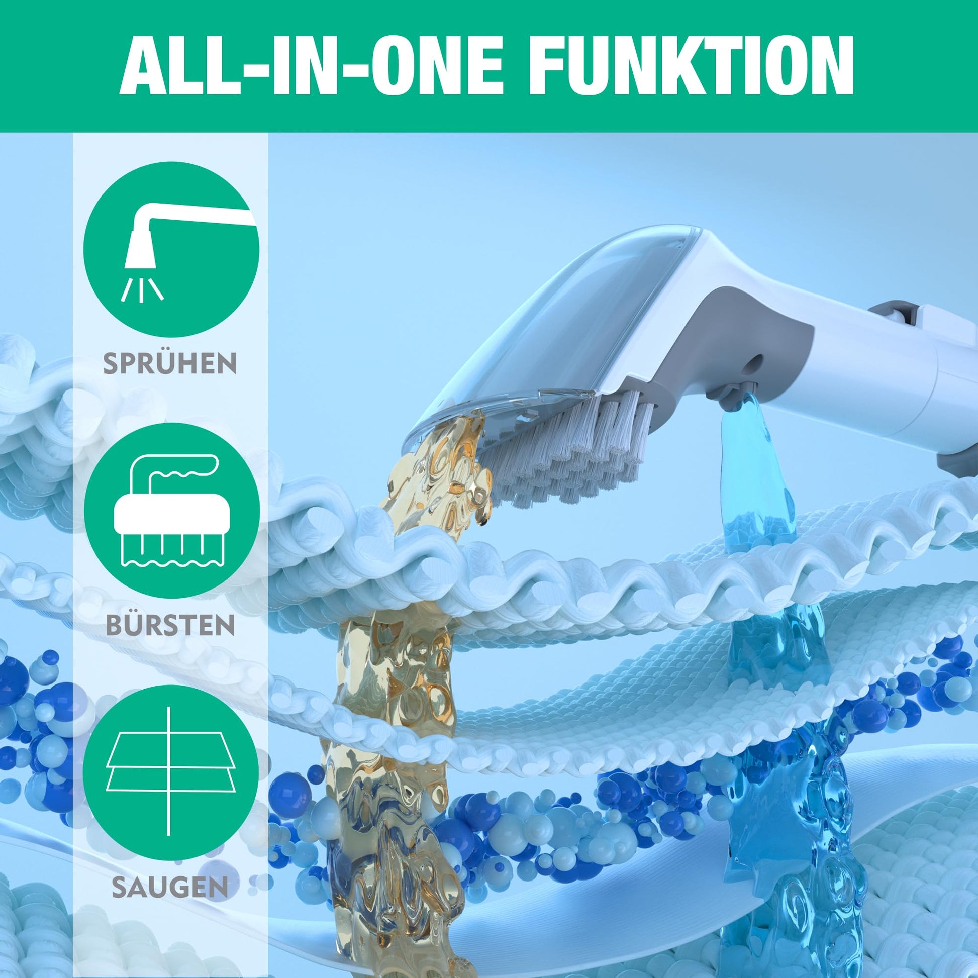 - Starke Saugleistung: Ein optimierter 450-Watt-Motor erzeugt eine Saugkraft von 12 kPa, die Staub und Schmutzwasser gleichzeitig aufnimmt und Textilien effizient reinigt.