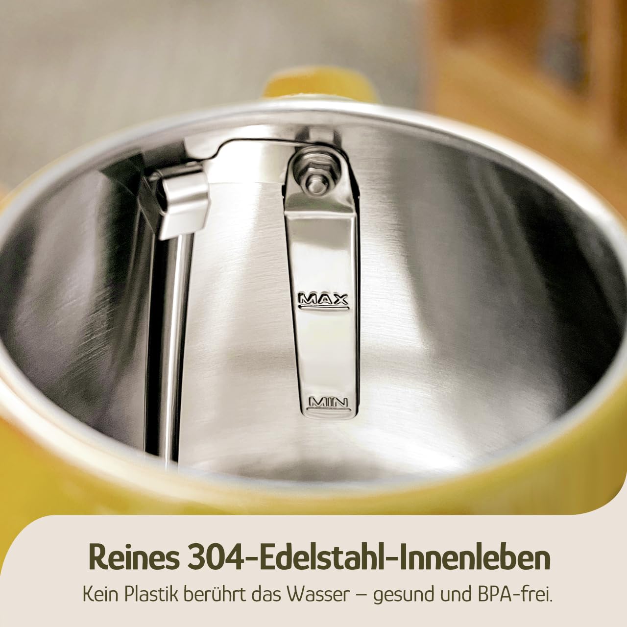 - Schnell und geräumig: Mit leistungsstarken 2200 Watt bringt der Wasserkocher bis zu 1,7 Liter Wasser (entspricht ca. 7 Tassen) in nur 4 bis 5 Minuten zum Sieden – ideal für den schnellen Tee oder Kaffee.