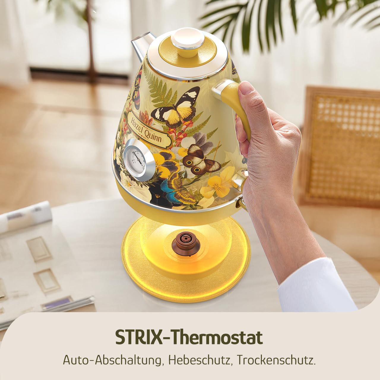 Verbinden Sie stilvolles Vintage-Flair mit hochmoderner Funktionalität. Dieser Wasserkocher im einzigartigen, geblümten Retro-Design ist ein echter Blickfang und überzeugt durch seine durchdachten Eigenschaften in jeder Küche.