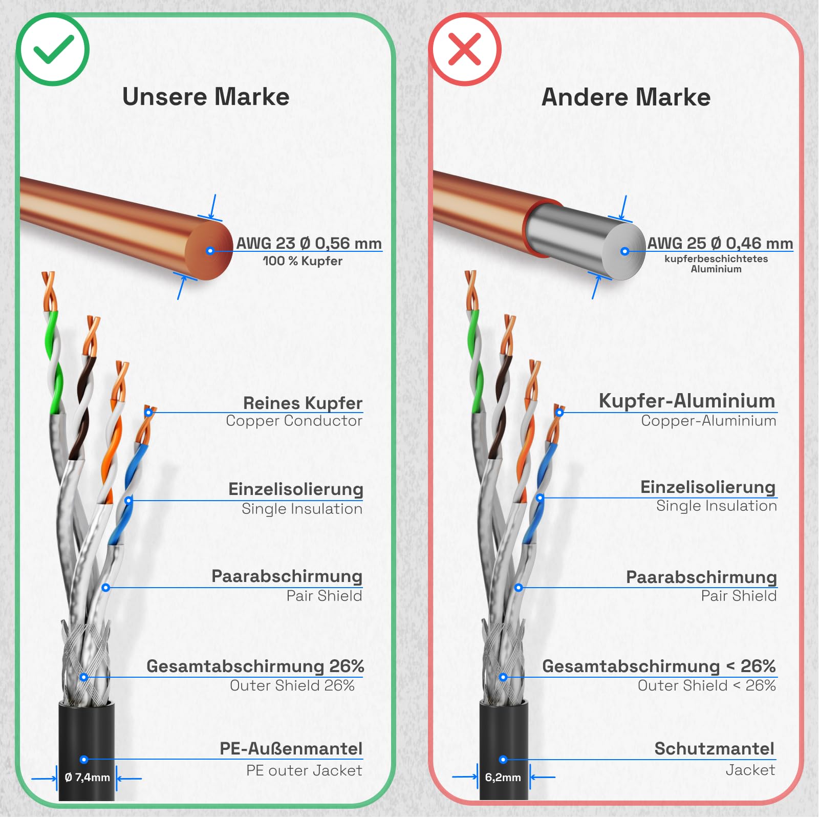 - Innenleiter: Reines Kupfer, AWG23