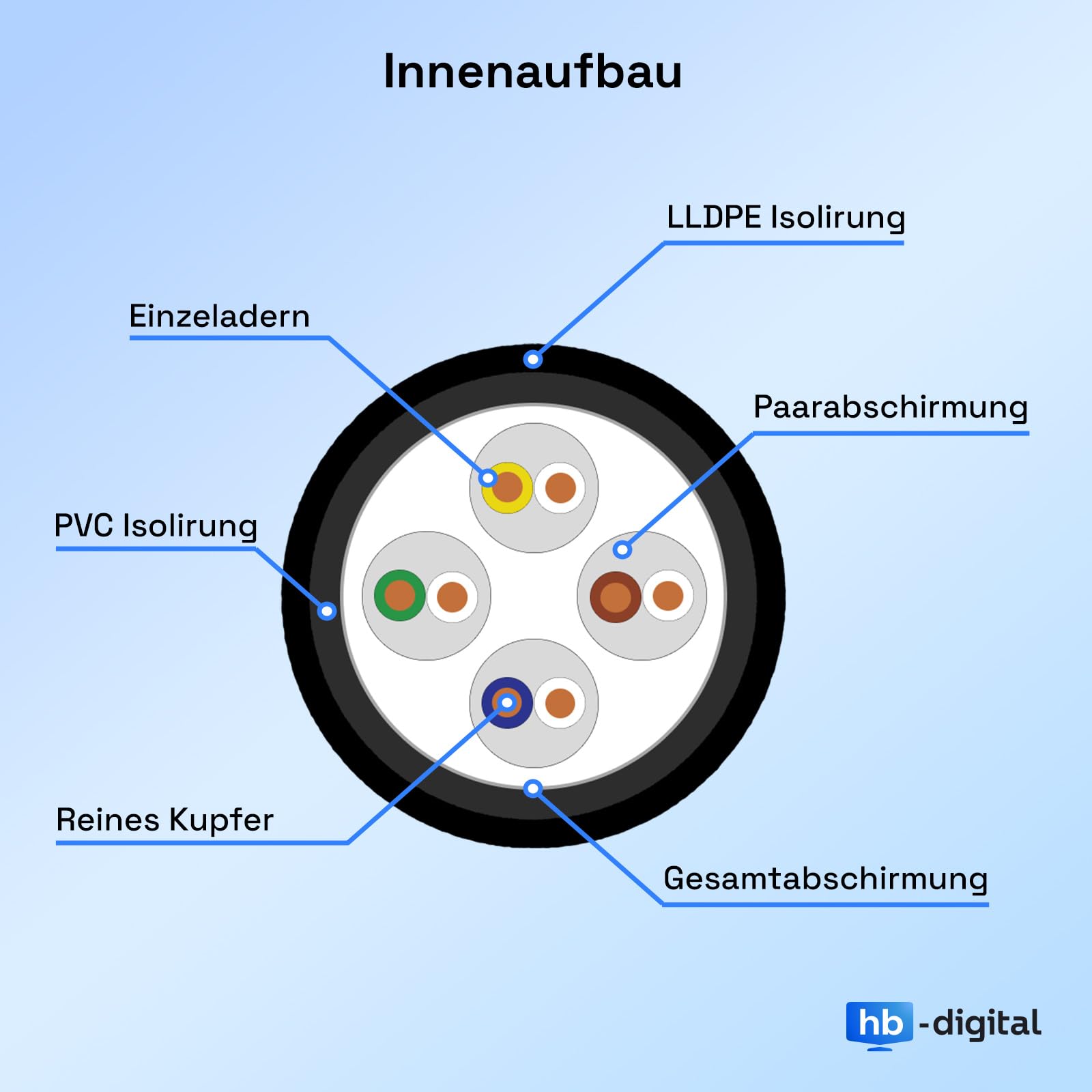 Ja, das Kabel wurde speziell für die direkte Erdverlegung und anspruchsvolle Ausseninstallationen entwickelt. Sein robuster, zweifacher Schutzmantel aus PVC und witterungsbeständigem LLDPE macht es extrem robust und wasserresistent.