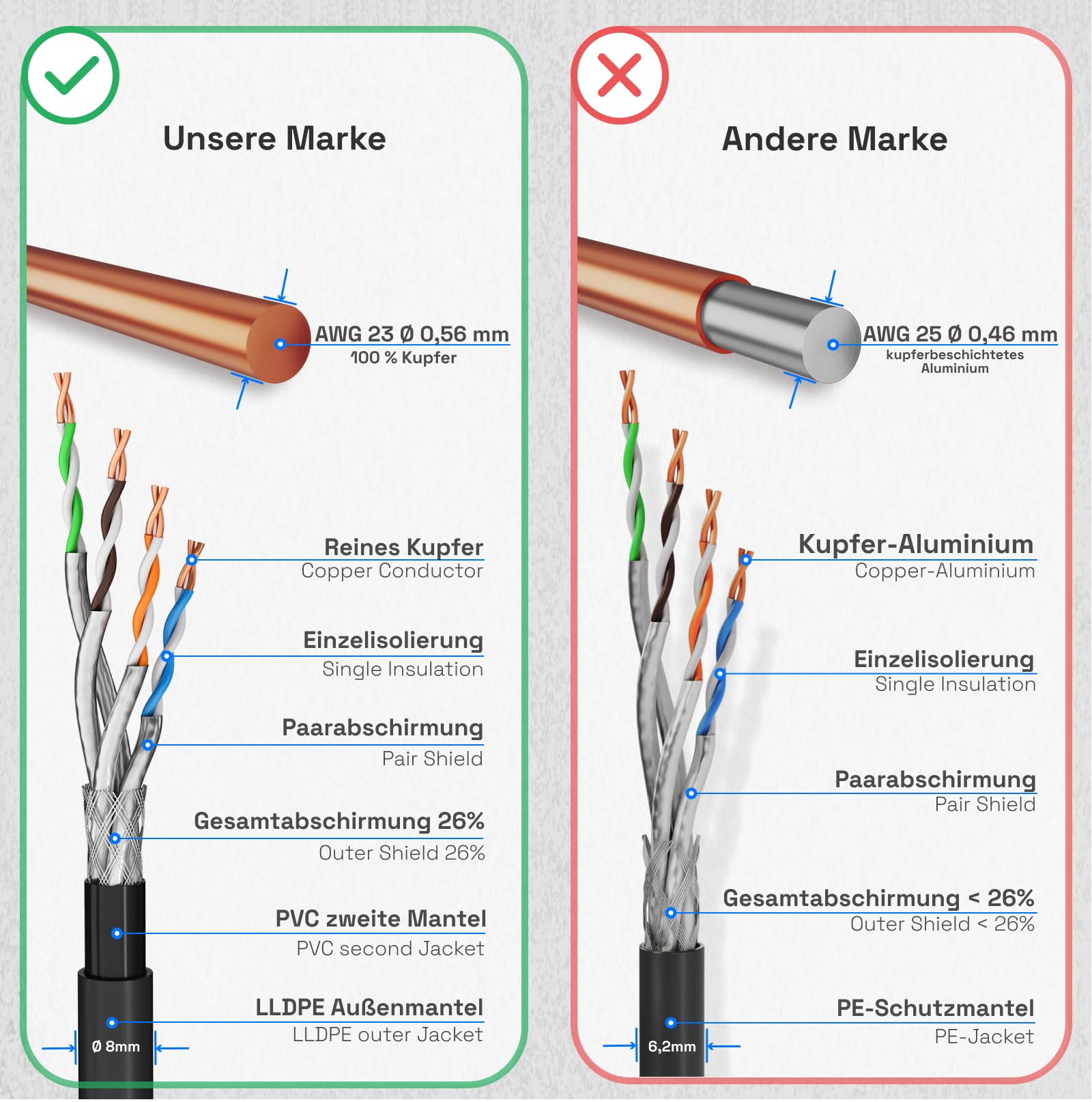 - Reine Kupferadern: Vier verdrillte Paare aus massivem Kupfer (AWG23/1) garantieren eine verlustarme und stabile Datenübertragung mit Geschwindigkeiten von bis zu 10 Gbit/s.
