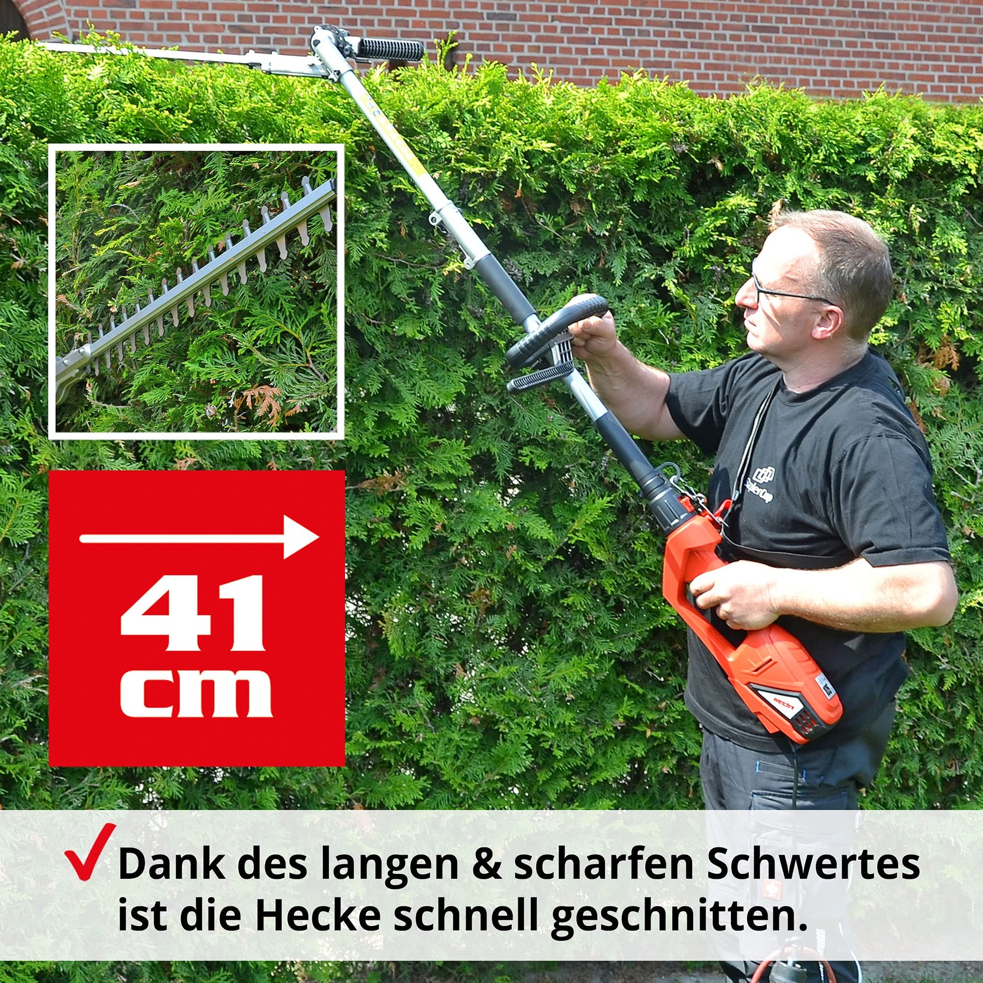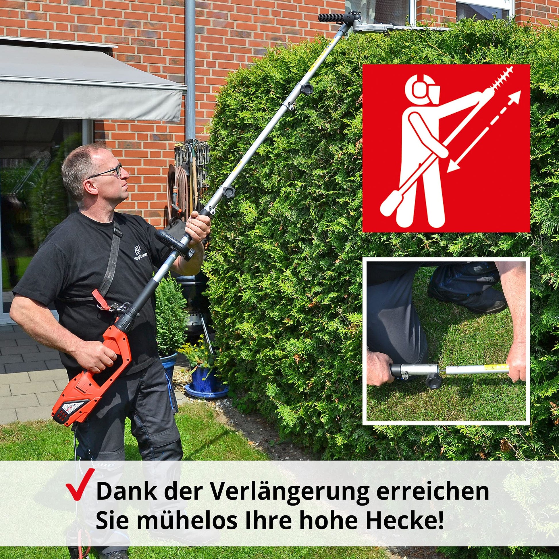 Absolut. Der grösste Sicherheitsvorteil ist, dass Sie dank der grossen Reichweite des Teleskopstiels nicht mehr auf eine wacklige Leiter steigen müssen. Sie können stets mit beiden Füssen sicher auf dem Boden stehen, was das Unfallrisiko beim Schneiden hoher Hecken erheblich reduziert.