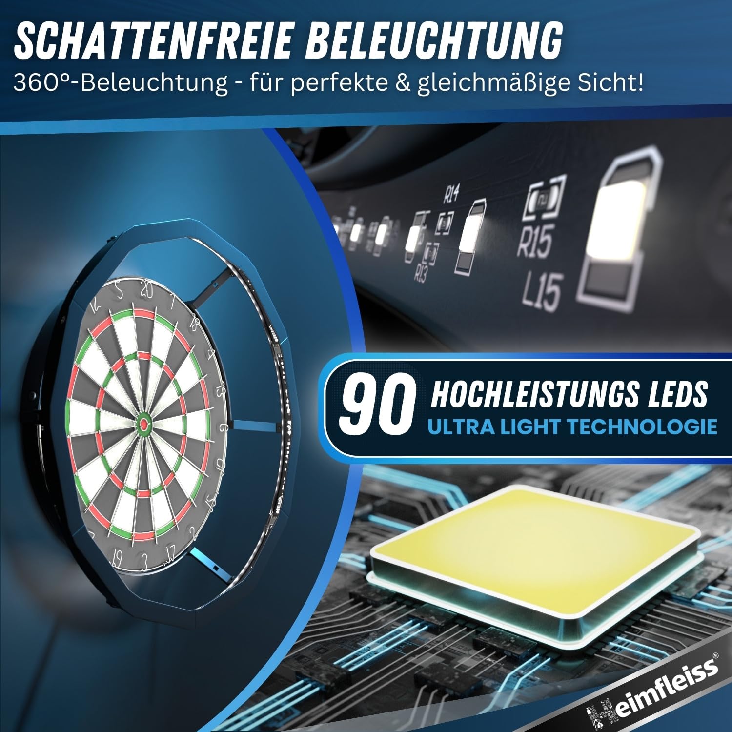 - Schattenfreie Ausleuchtung: 90 strategisch angeordnete Ultra-Light-LEDs garantieren eine absolut gleichmässige und blendfreie Beleuchtung des gesamten Dartboards.