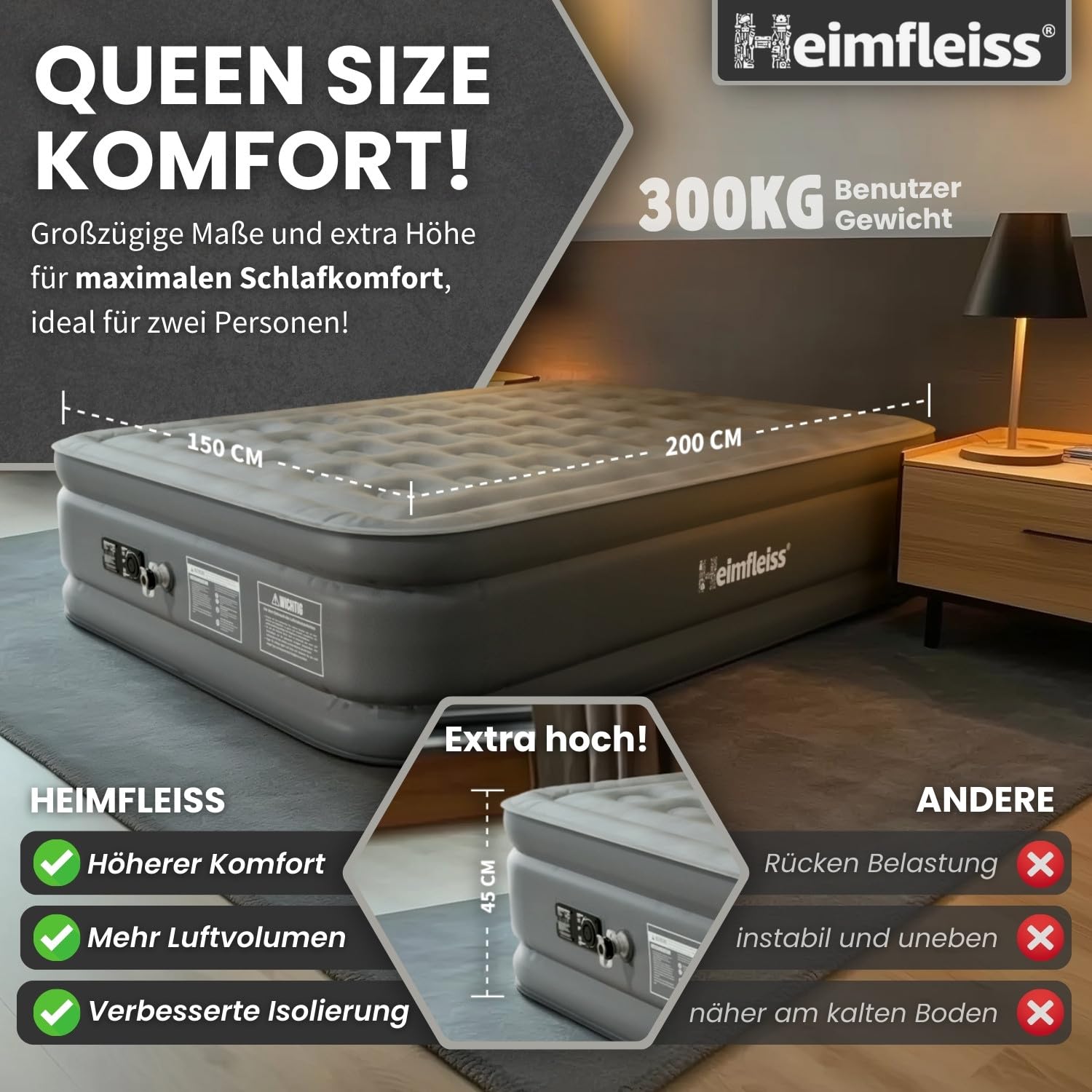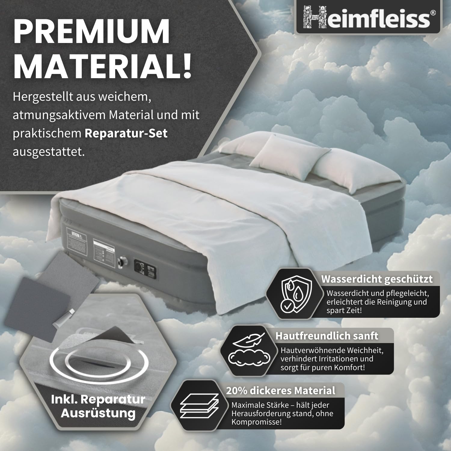 Heimfleiss® Luftmatratze selbstaufblasend 150x200 cm | Premium Luftbett 2 Personen | Schnell Aufblasbare Matratze ideal nutzbar als Gästebett & Camping Bett | Selbstaufblasbare Gästematratze mit Pumpe