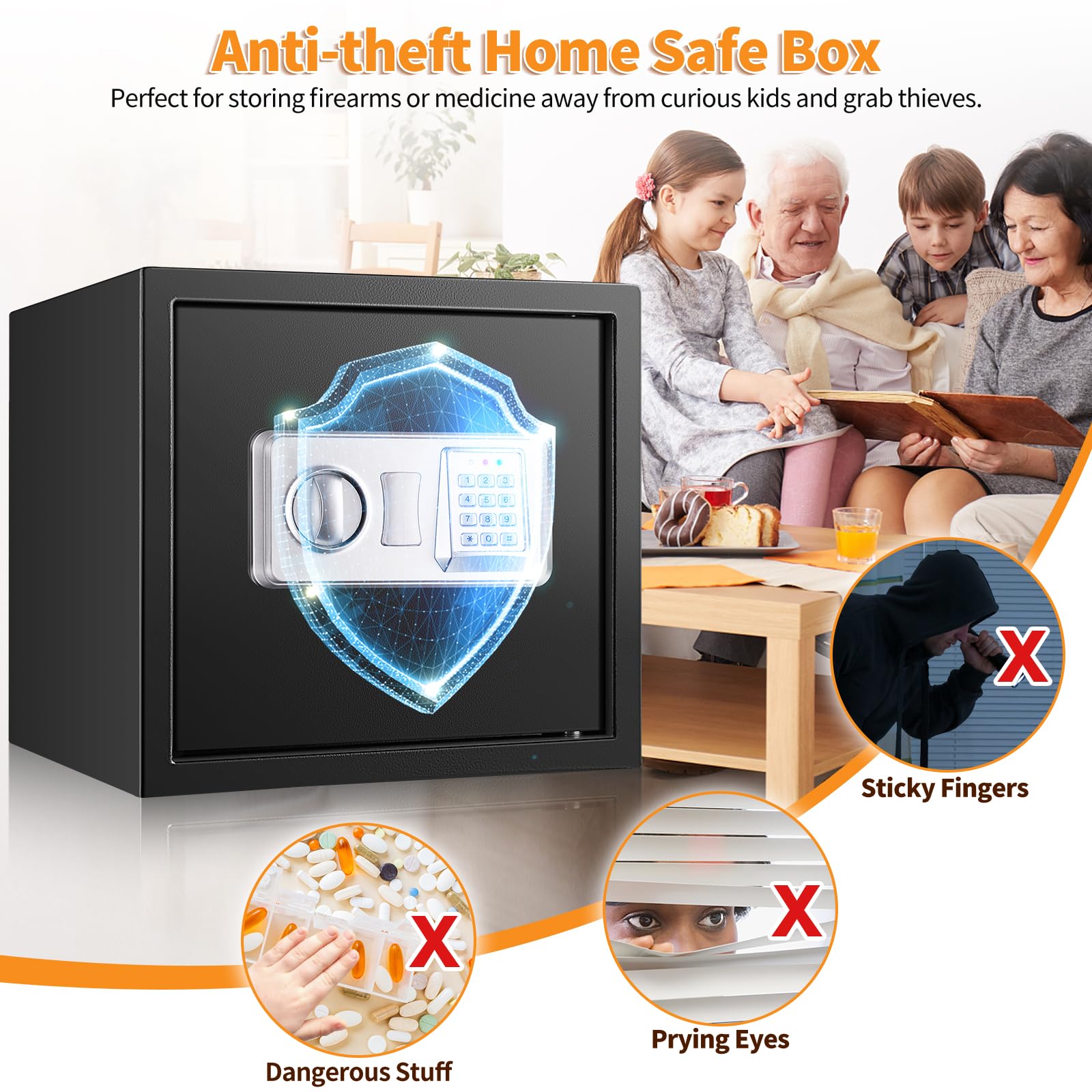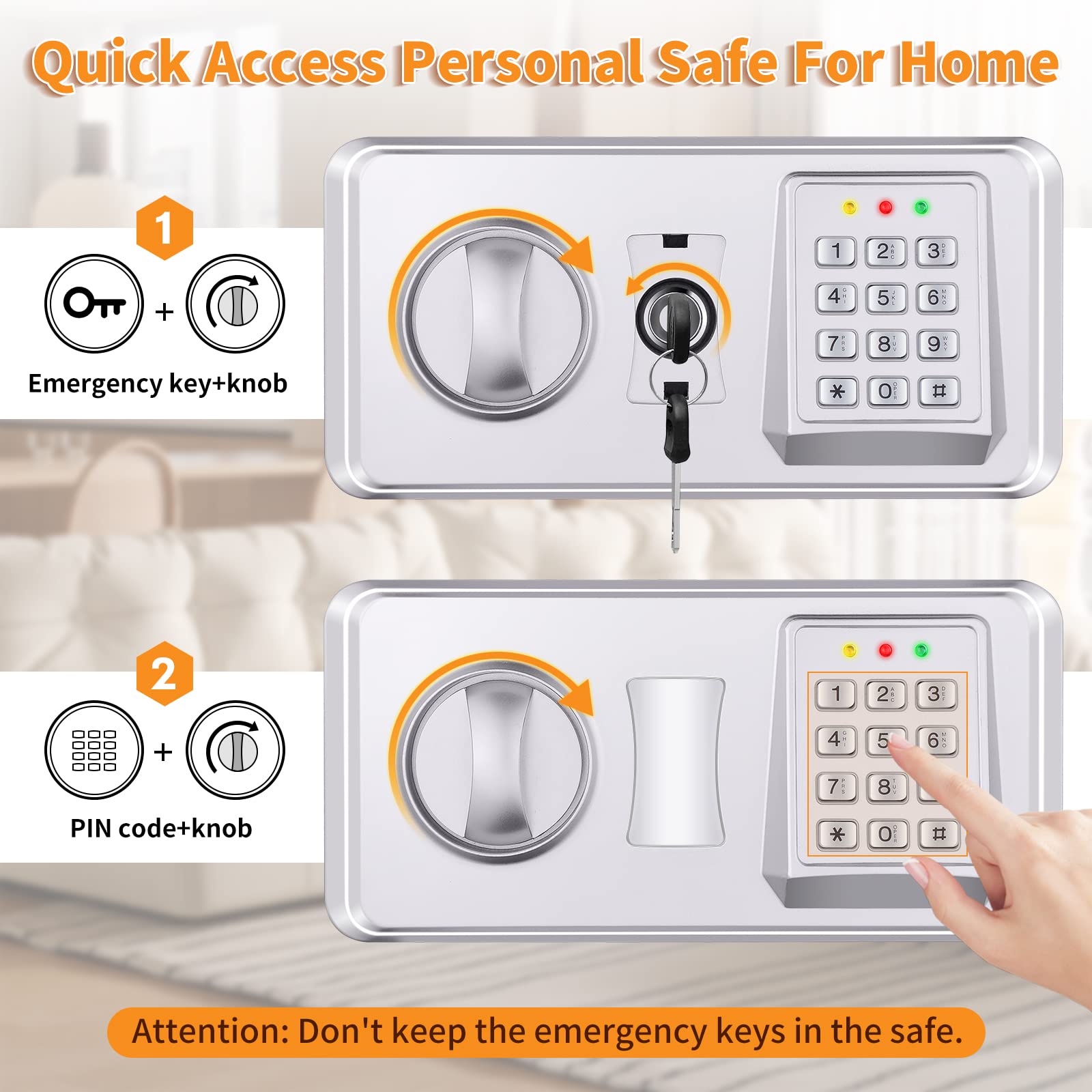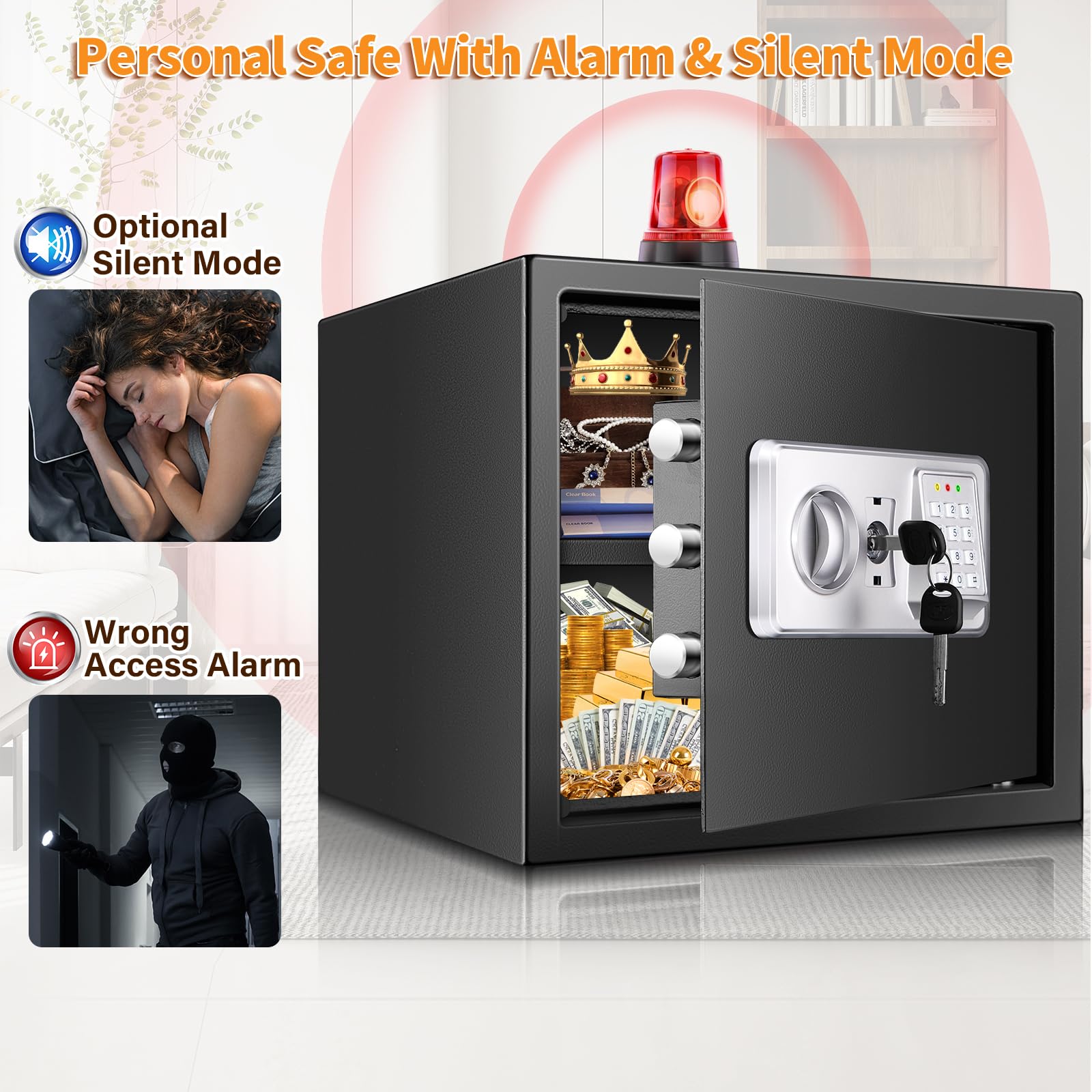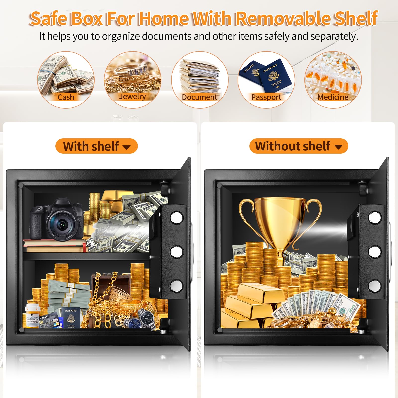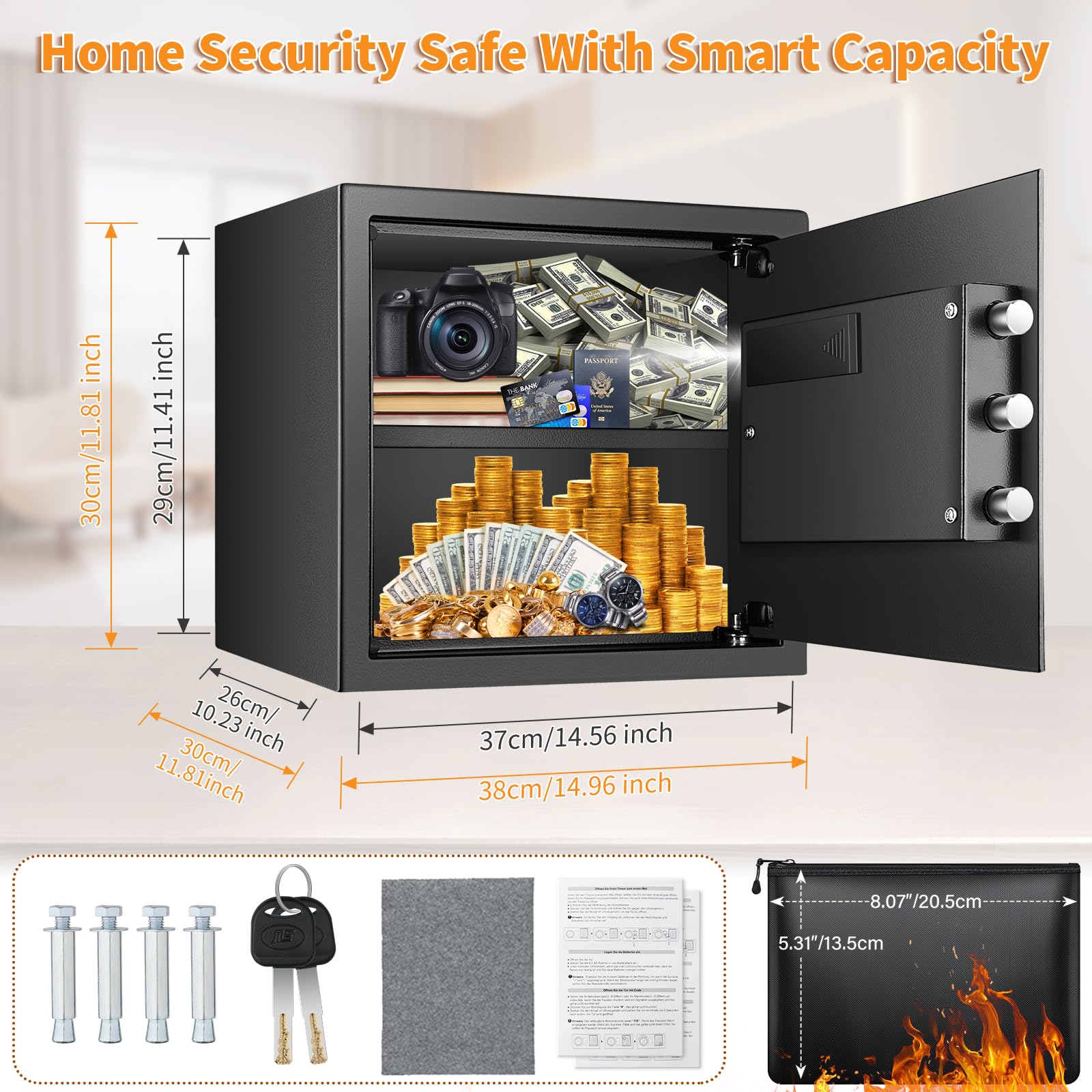 - Zusatzausstattung: Inklusive einer feuerfesten und wasserdichten Geldtasche (20.5 x 13.5 cm), einem herausnehmbaren Regal, Sensorlicht und einer Schutzmatte.