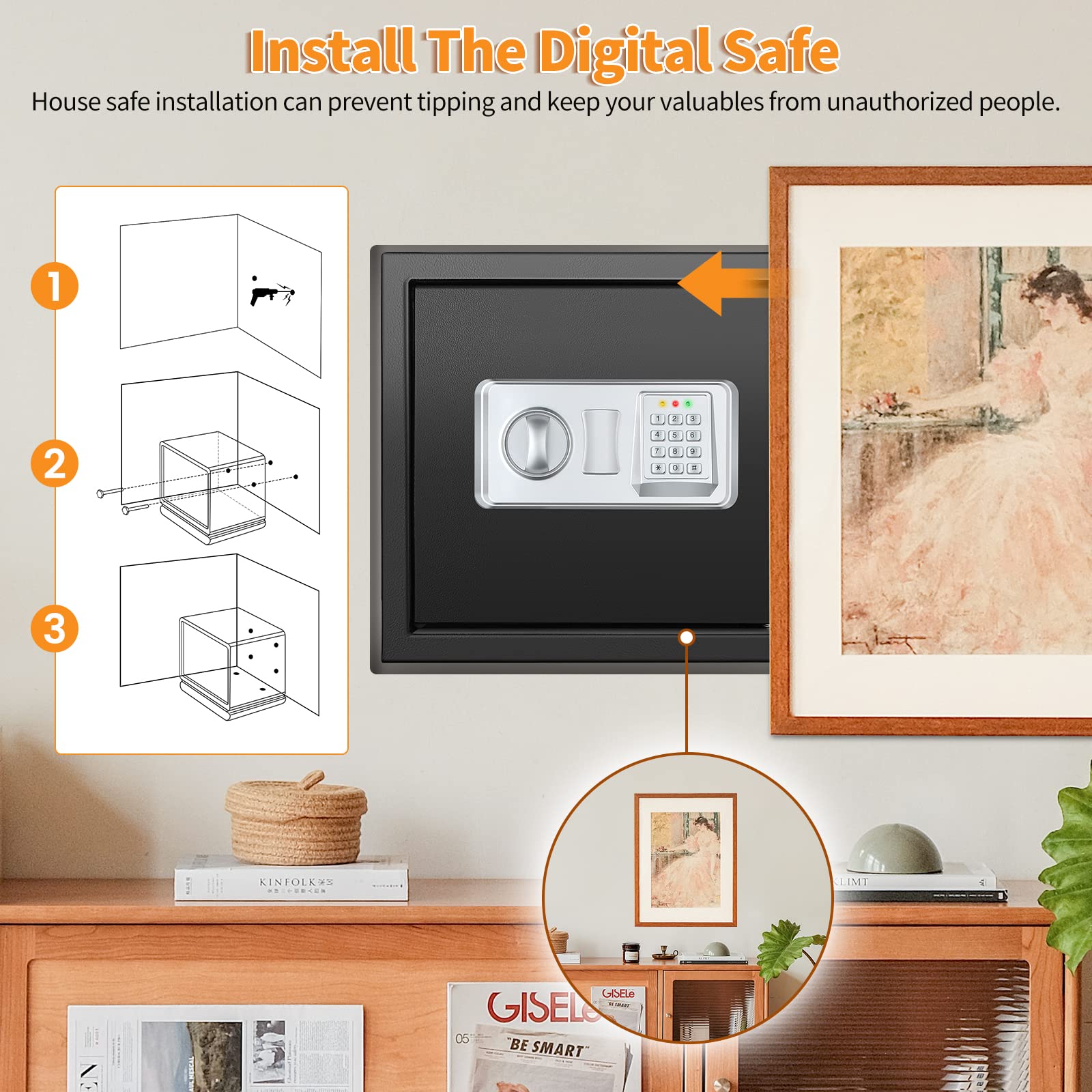 Flexibel und durchdacht: Das herausnehmbare Regal ermöglicht es Ihnen, den Innenraum flexibel zu organisieren und an Ihre Bedürfnisse anzupassen. Ein integriertes Sensorlicht erleichtert den Zugriff bei schlechten Lichtverhältnissen. Dank der vorgebohrten Löcher und dem mitgelieferten Befestigungsmaterial kann der Tresor einfach und sicher an der Wand oder am Boden verankert werden, was die Diebstahlsicherheit zusätzlich erhöht.