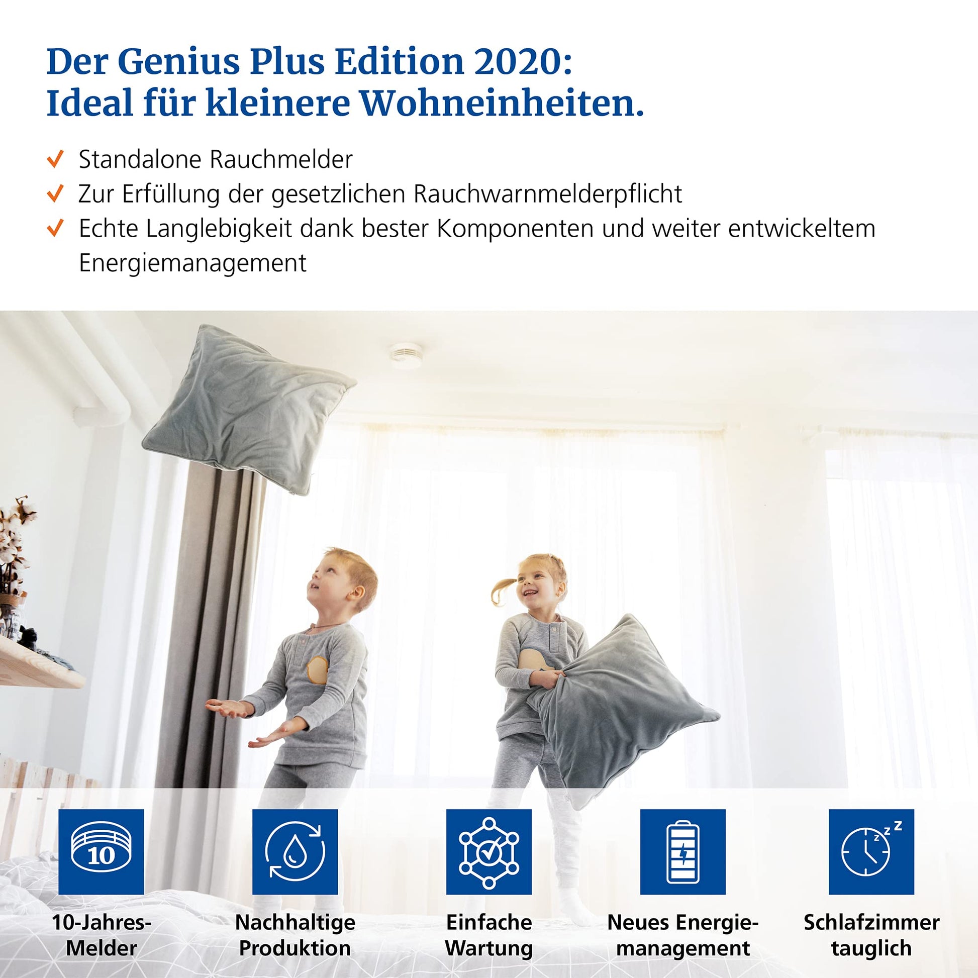 Der Genius Plus verfügt über eine fest verbaute Lithium-Batterie mit einer Lebensdauer von 10 Jahren. Das bedeutet, Sie müssen ein ganzes Jahrzehnt lang keine Batterien wechseln und profitieren von durchgehender Sicherheit bei minimalem Wartungsaufwand.