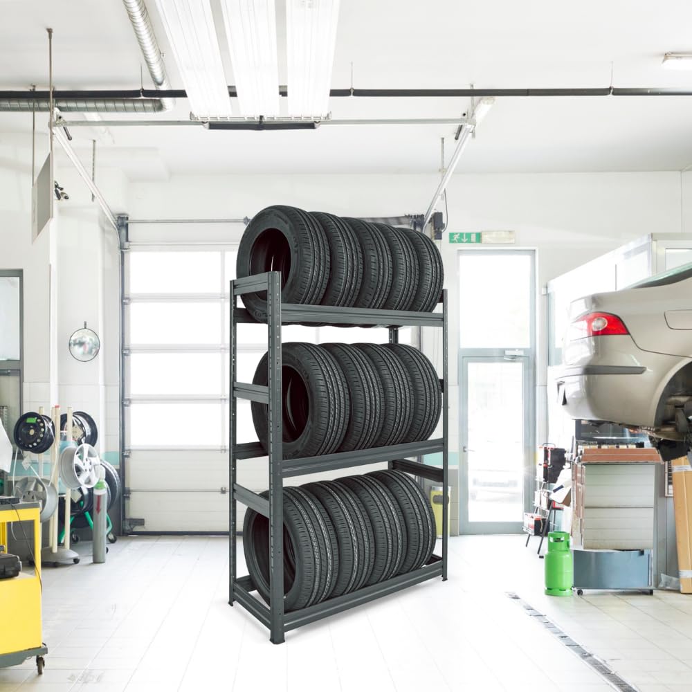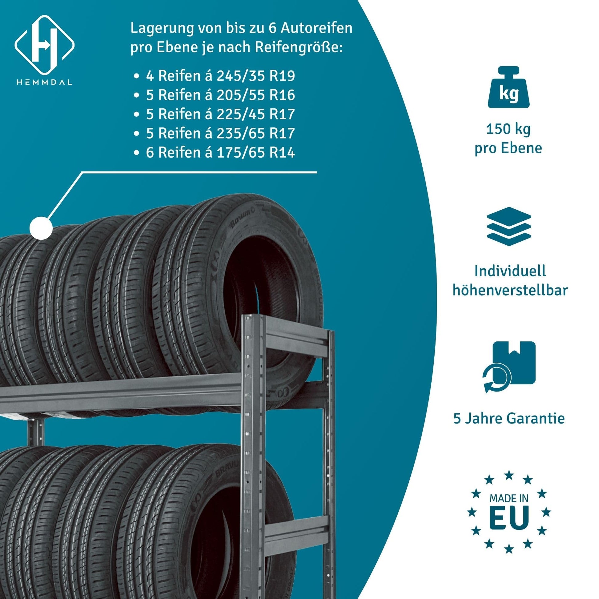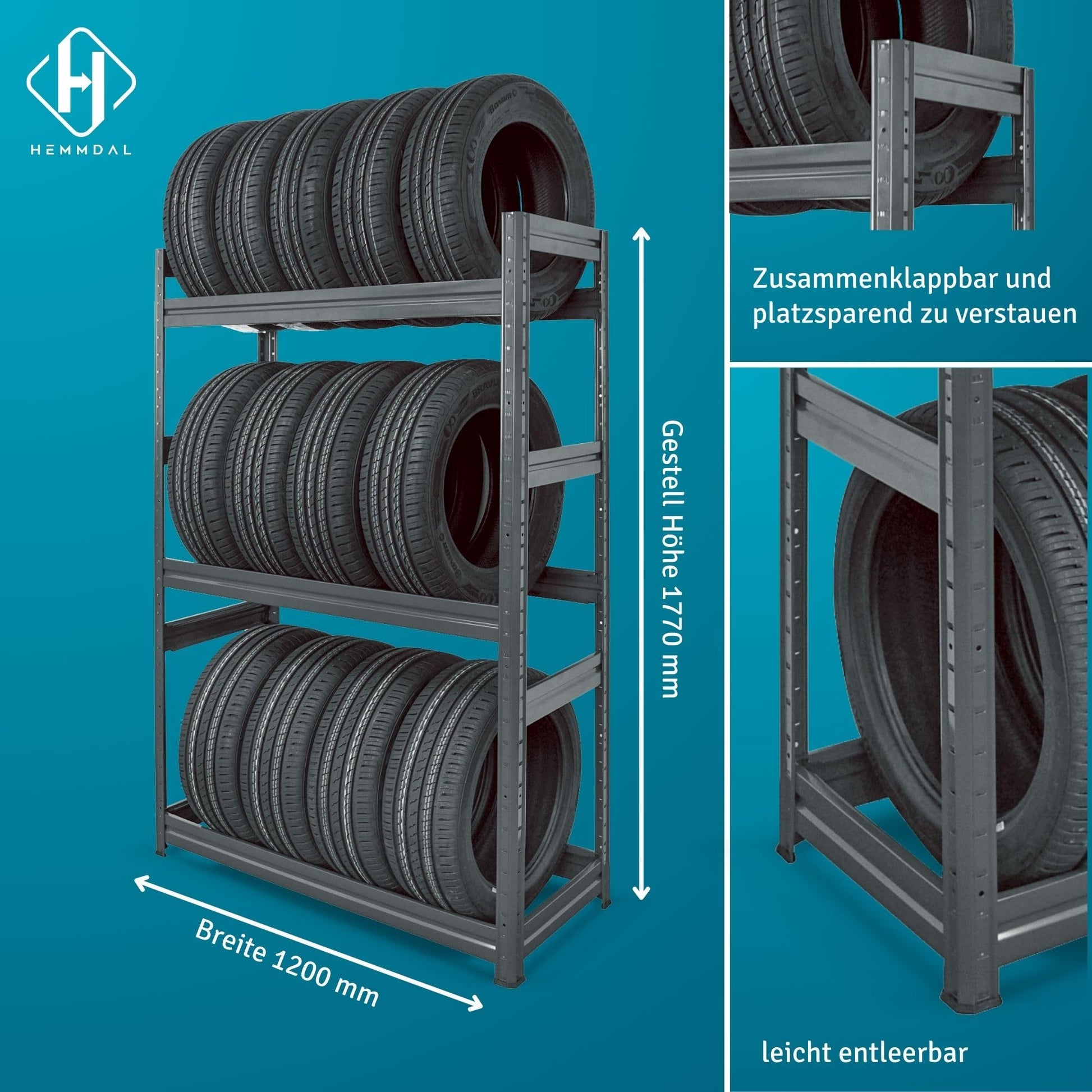 Das Schwerlastregal ist für die platzsparende und übersichtliche Lagerung von bis zu 18 Reifen konzipiert. Es hat die Masse 177 x 120 x 50 cm (HxBxT) und passt somit ideal in Garage, Keller oder Werkstatt.