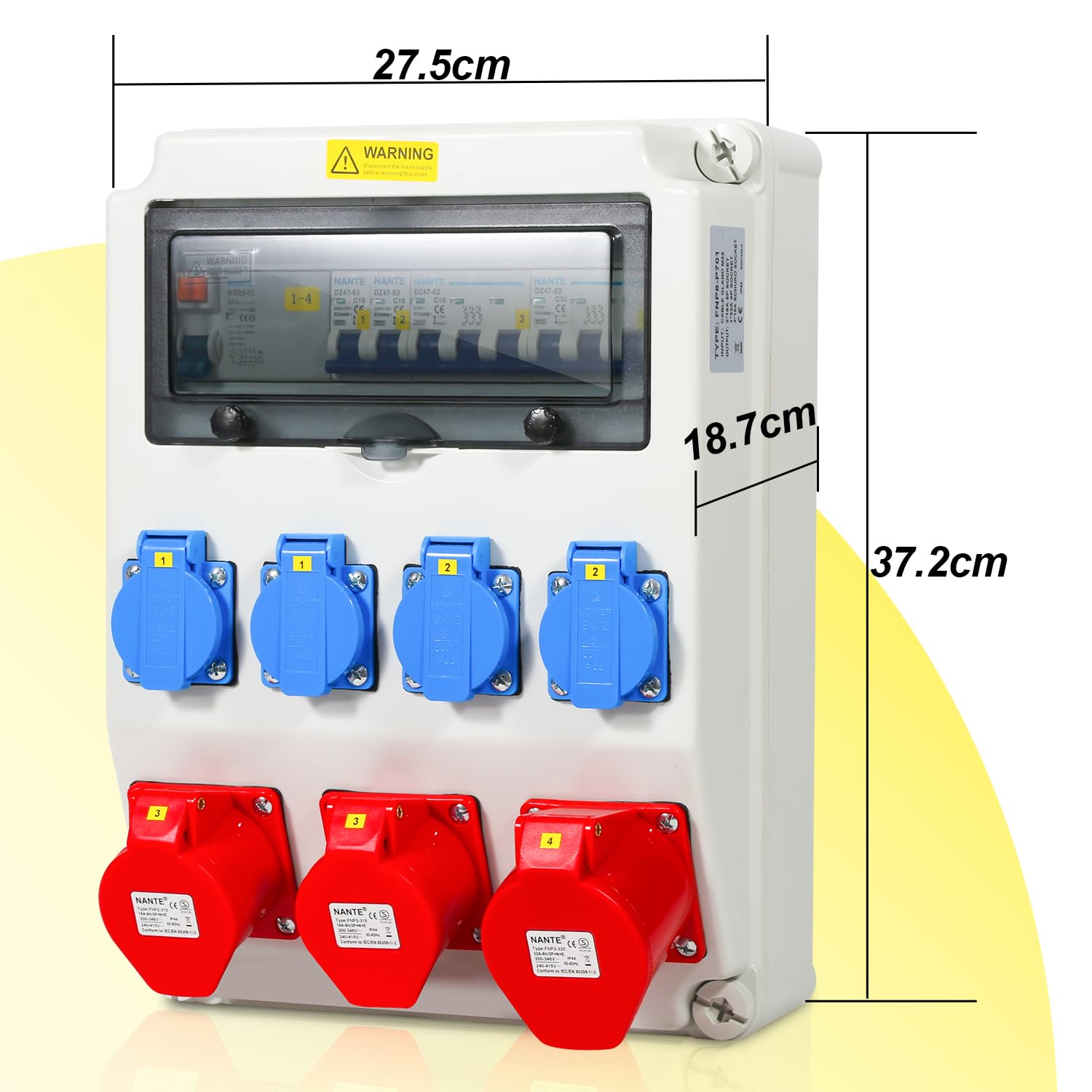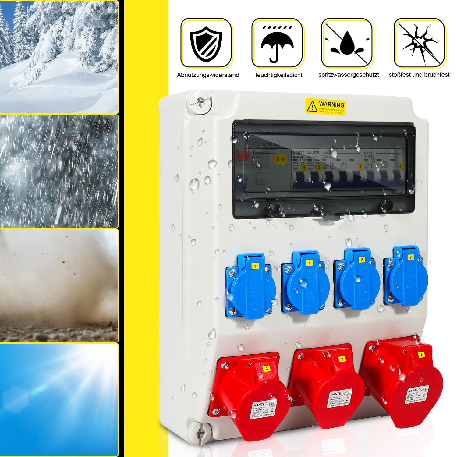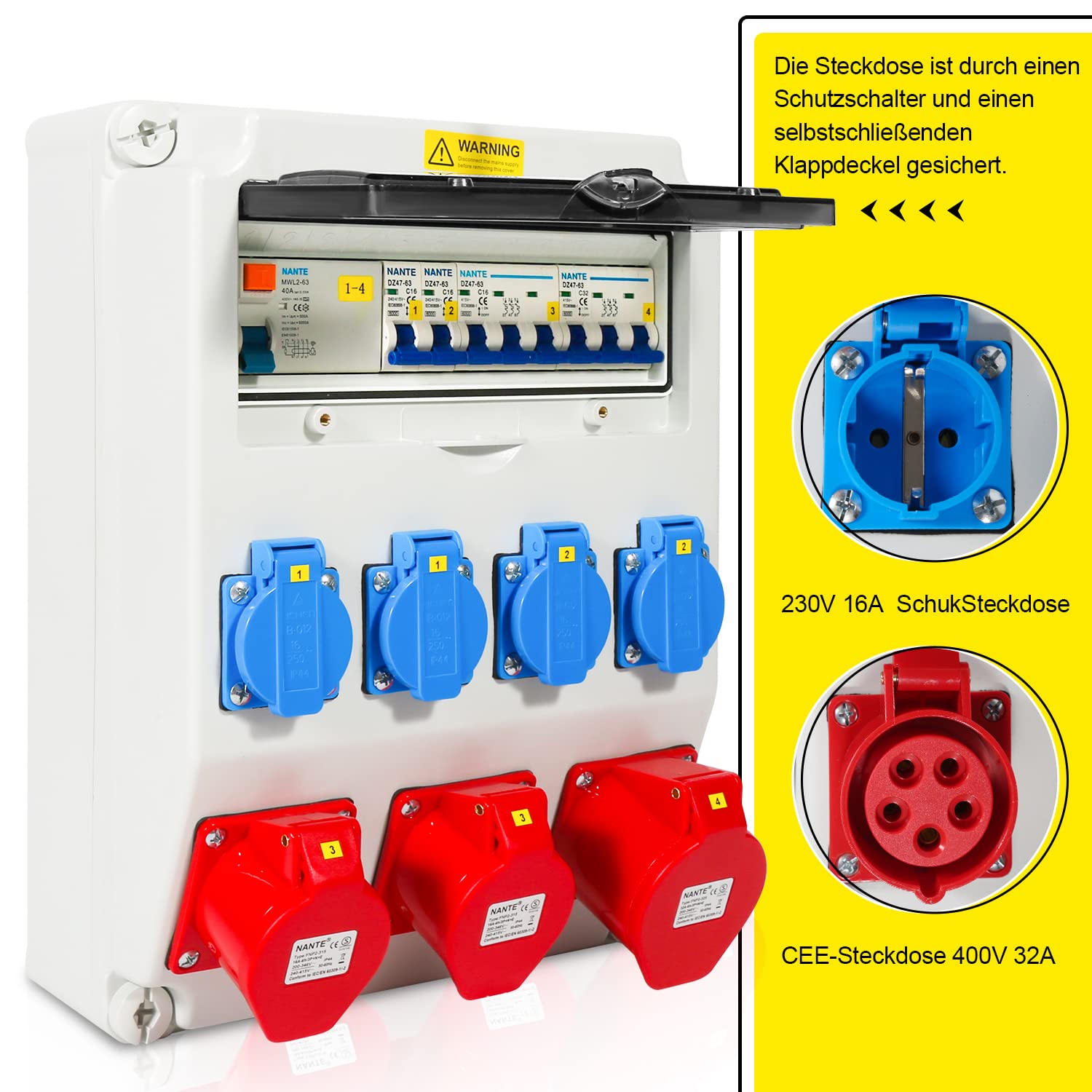 - Vielseitige Anschlüsse: Ausgestattet mit einer 32A- und zwei 16A-CEE-Steckdosen (5-polig) sowie vier 230V-Schutzkontaktsteckdosen für maximale Flexibilität.