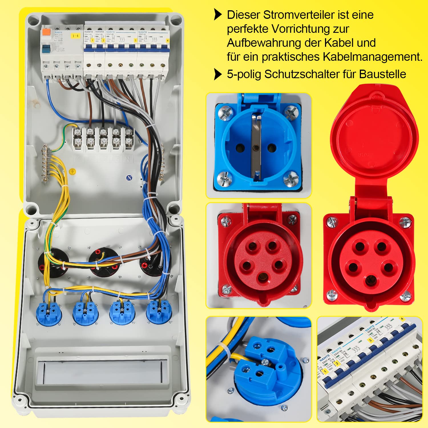 Er ist ideal für Baustellen, Werkstätten und den Aussenbereich. Dank der Kombination aus Starkstrom- (1x 32A, 2x 16A CEE) und Standard-Steckdosen (4x 230V) können Sie gleichzeitig grosse Baumaschinen und kleinere Elektrowerkzeuge sicher betreiben.