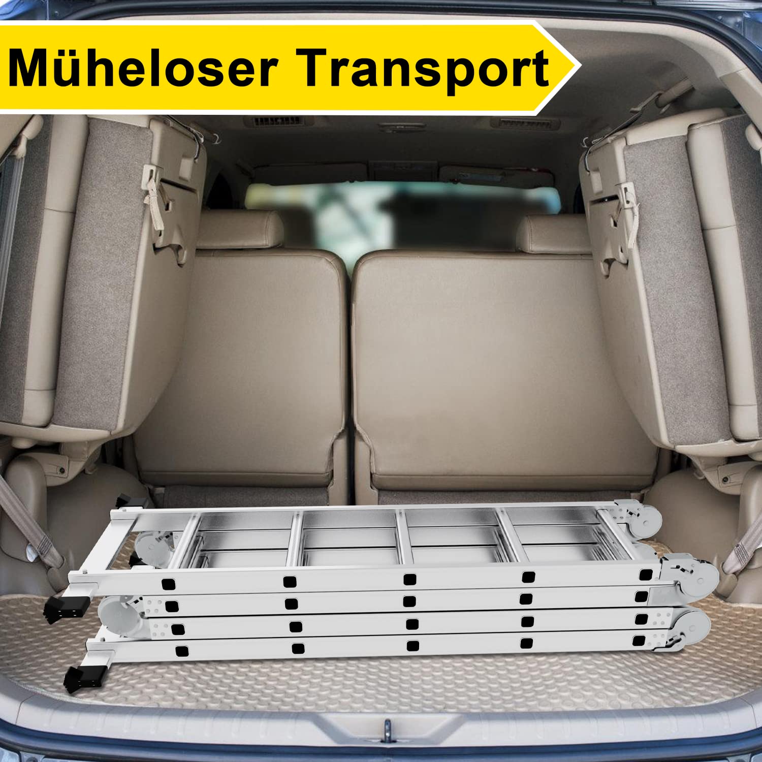 - Kompakt & Mobil: Die Leiter lässt sich auf ein minimales Mass zusammenklappen und passt so bequem in die meisten Autos oder lässt sich platzsparend in der Garage oder im Keller verstauen. Die mitgelieferten Räder erleichtern den Transport zum Einsatzort.