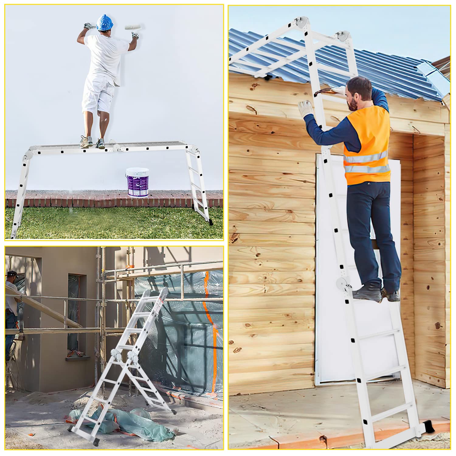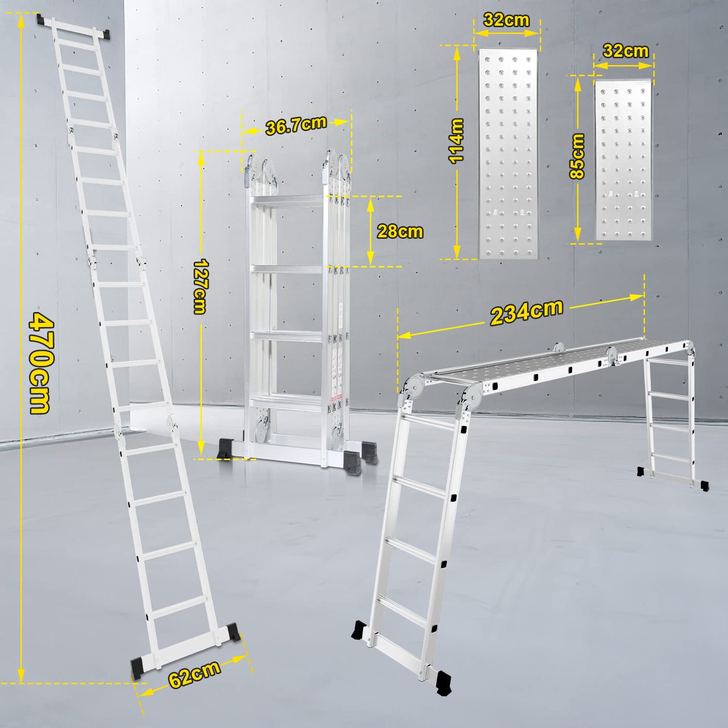 Diese 7-in-1 Multifunktionsleiter ist der flexible und zuverlässige Partner für alle Arbeiten rund um Haus, Garten und Werkstatt. Gefertigt aus einer hochwertigen und langlebigen Aluminiumlegierung, kombiniert sie eine hohe Tragfähigkeit mit geringem Gewicht für eine einfache Handhabung bei jedem Projekt.