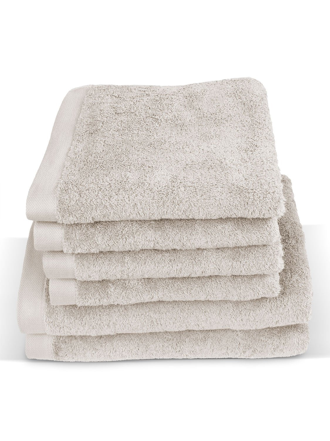 Das 6-teilige Set besteht aus vier Handtüchern (50 x 100 cm) und zwei Duschtüchern (70 x 140 cm). Alle Tücher sind in der eleganten Farbe Sandgrau gehalten und mit einer feingemusterten Bordüre veredelt.
