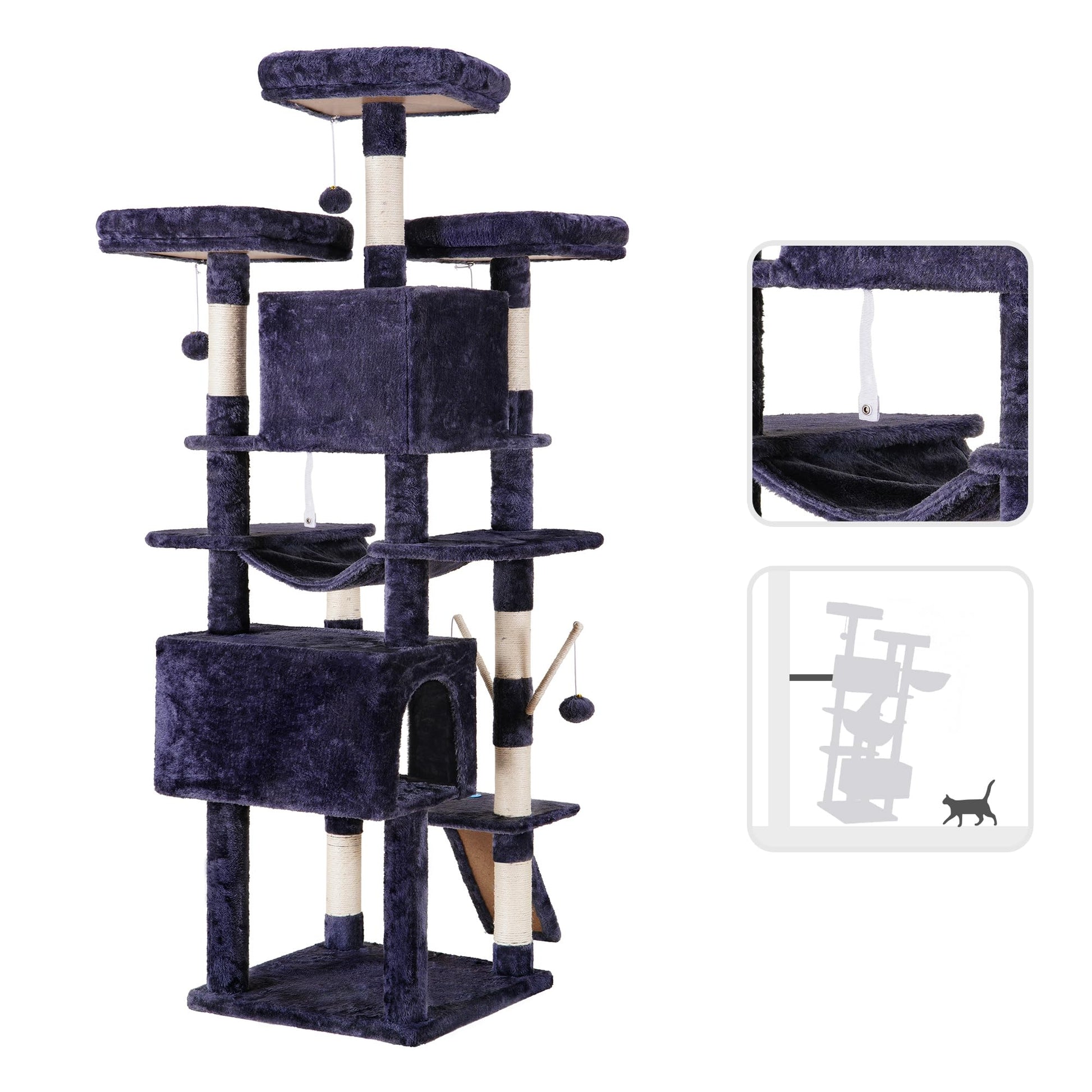 - Vielfältige Ruhezonen: Weich gepolsterte obere Plattformen laden zum Beobachten ein, während zwei geräumige Katzenhöhlen als private und geschützte Rückzugsorte dienen.